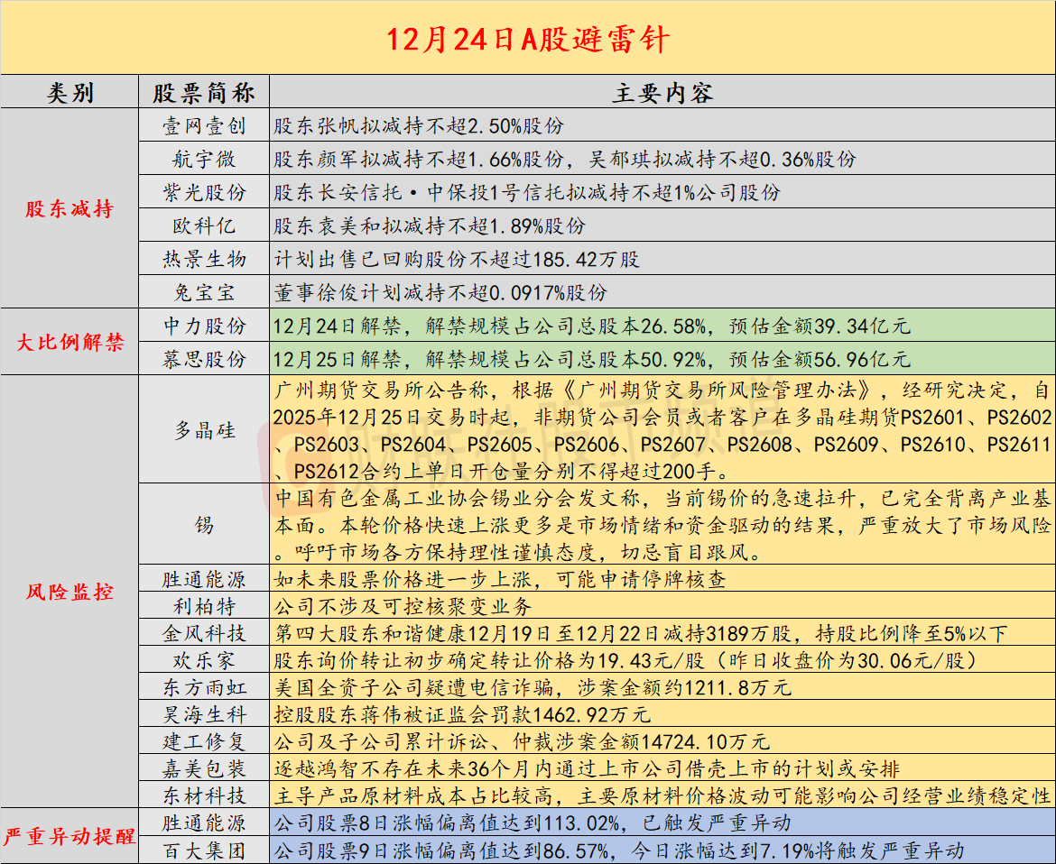 导读:智通财经12月24日投资避雷针,近日,A股及海外市场潜在风险事件如下。国内经济信息方面包括:1)广期所调整铂等品种相关期货合约交易手续 费标准、涨跌停板幅度和交易保证金标准;2)锡业分会发文,锡价急速拉升已完全背离基本面;公司方面重点关注包括:1)8连板胜通能源表示,如未来 股票价格进一步上涨,可能申请停牌核查;2)2连板利柏特公告,公司不涉及可控核聚变业务;海外市场重点关注包括:1)美国第三季度GDP远超预期, 通胀隐忧仍存;2)日本核反应堆20毫升含放射性水泄漏。 经济信息 1、广州期货交易所公告称,根据《广州期货交易所风险管理办法》,经研究决定,自2025年12月25日交易时起,非期货公司会员或者客户在多晶硅期货 PS2601、PS2602、PS2603、PS2604、PS2605、PS2606、PS2607、PS2608、PS2609、PS2610、PS2611、PS2612合约上单日开仓量分别不得超过200手。 2、广期所公告,经研究决定,对铂、钯、碳酸锂期货相关合约的交易手续费标准、涨跌停板幅度和交易保证金标准作如下调整:自2025年12月25日交易时 起,铂期货PT2606合约、钯期货PD ...