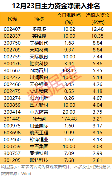 市场整体资金流向 - A股三大指数于12月23日集体收涨,但行业板块涨少跌多,涨幅居前的板块包括能源金属、电池、玻璃纤维、电子化学品、贵金属,跌幅居前的板块包括旅游酒店、教育、房地产服务、航天航空、软件开发 [1] - 沪深两市全天主力资金净流出322.18亿元,仅有6个行业获得主力资金净流入 [1] - 25个行业遭遇主力资金净流出,其中国防军工和电子行业净流出均超50亿元,通信、计算机、汽车行业净流出均超30亿元,医药生物、非银金融、农林牧渔等行业净流出均超10亿元 [1] 行业主力资金净流入 - 电力设备行业主力资金净流入36.56亿元,位居首位 [1] - 基础化工行业主力资金净流入12.78亿元 [1] - 建筑材料行业主力资金净流入3.58亿元 [1] - 银行行业主力资金净流入1.28亿元 [1] 行业主力资金净流出 - 国防军工行业主力资金净流出超50亿元 [1] - 电子行业主力资金净流出超50亿元 [1] - 通信行业主力资金净流出超30亿元 [1] - 计算机行业主力资金净流出超30亿元 [1] - 汽车行业主力资金净流出超30亿元 [1] 个股主力资金净流入 - 78只个股主力资金净流入超1亿元,其中8只净流入超5亿元 [2] - 多氟多主力资金净流入12.48亿元,股价涨停,其所属锂电池概念走强,消息面上11月国内电池级碳酸锂价格从81000元/吨上涨至92000元/吨,涨幅13.58% [2] - 英维克主力资金净流入10.35亿元,与液冷服务器概念反复活跃相关,机构看好数据中心液冷替代风冷的趋势 [2] - 其他净流入居前的个股包括:宁德时代净流入8.84亿元,天赐材料净流入8.84亿元,天际股份净流入7.44亿元,胜宏科技净流入5.46亿元,N纳百川净流入5.35亿元,川润股份净流入5.14亿元 [3] 个股主力资金净流出 - 68只个股主力资金净流出超2亿元 [3] - 山子高科主力资金净流出11.34亿元 [4] - 上海瀚讯主力资金净流出10.62亿元 [4] - 领益智造主力资金净流出9.41亿元 [4] - 通宇通讯主力资金净流出7.98亿元 [4] - 海马汽车主力资金净流出7.44亿元 [4] - 三花智控主力资金净流出7.19亿元 [4] - 航天机电主力资金净流出7.09亿元 [4] 尾盘资金流向 - 尾盘沪深两市主力资金净流出57.12亿元 [4] - 尾盘电力设备行业主力资金净流入超1亿元,建筑材料、建筑装饰行业尾盘净流入均超3000万元 [4] - 个股尾盘净流入方面,航天发展净流入2.06亿元,保变电气净流入1.32亿元,天齐锂业、多氟多、N纳百川、立讯精密、英维克净流入也居前 [5] - N纳百川为上市新股,收盘上涨408.17%,公司主营新能源汽车动力电池热管理等产品 [5] - 个股尾盘净流出方面,新易盛净流出2.02亿元,三花智控净流出1.41亿元,雪人集团净流出1.22亿元 [6]
