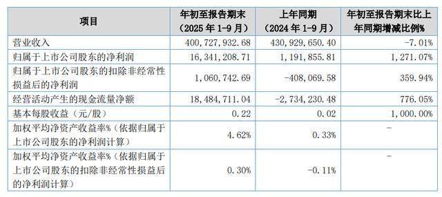 瑞财经 钟鸣辰格利尔(BJ920641)近日发布2025年三季报,前三季同比增利不增收。 | 项目 | 年初至报告期末 (2025年1-9月) | 上年同期 (2024年1-9月) | 年初至报告期末出上 年同期增减比例% | | --- | --- | --- | --- | | 营业收入 | 400.727.932.68 | 430. 929. 650. 40 | -7.01% | | 归属于上市公司股东的净利润 | 16, 341, 208. 71 | 1.191.855.81 | 1, 271. 07% | | 归属于上市公司股东的扣除非经常性 损益后的净利润 | 1.060.742.69 | -408,069.58 | 359. 94% | | 经营活动产生的现金流量净额 | 18, 484, 711, 04 | -2.734.230. 48 | 776. 05% | | 基本每股收益(元/股) | 0.22 | 0.02 | 1.000.00% | | 加权平均净资产收益率%(依据归属于 上市公司股东的净利润计算) | 4.62% | 0. 33% | | | 加权平均净资产收益率%(依据归属于 ...