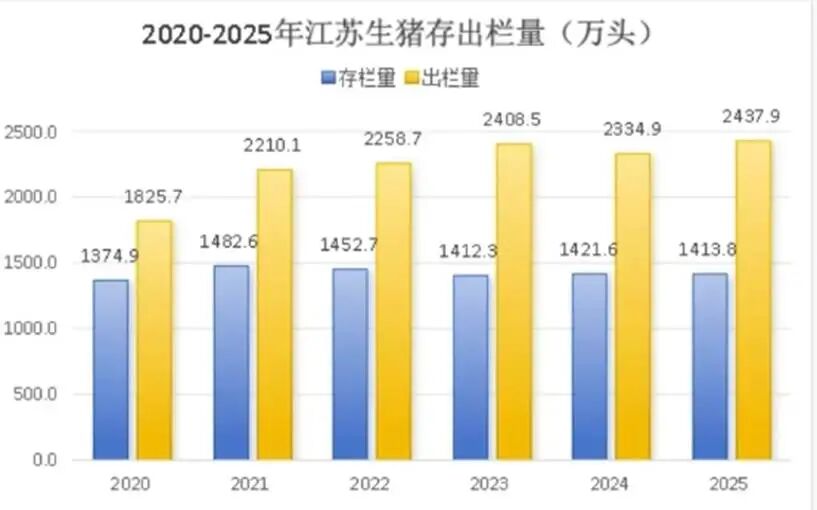 江苏省畜禽产品供给与价格动态 - 2025年江苏省居民消费价格指数(CPI)比上年下降0.2%,其中食品价格下降1.7%,主要受鲜菜、猪肉等价格下降拉动[1][5] - 消费端价格下降得益于生产端产能持续释放,“十四五”期间江苏省加快构建畜禽产品高质量供给体系,肉蛋奶供给能力稳步提升[1][5] 主要畜禽产品产量数据 - 2025年全省肉类总产量达到351.9万吨,禽蛋产量205.0万吨,牛奶产量76.1万吨,多项指标创近年新高[1][5] - 2025年牛奶产量76.1万吨,创历史新高,较2020年增长20.9%[5][10] 生猪养殖产业情况 - 生猪产能稳定,存栏量连续五年保持在1400万头以上,出栏量呈逐步增长趋势[1][5] - 2025年全省生猪出栏2437.9万头,创近7年新高,较2020年增长33.5%[1][5] 家禽养殖产业情况 - 江苏省是肉鸡及蛋鸡养殖优势区,养殖规模大、基础好,“十四五”期间产能不断扩大[3][8] - 2025年全省家禽出栏9.1亿只,创近13年新高,同比增长7.1%,较2020年增长28.8%[3][8] 肉牛与牛奶产业情况 - 2025年末全省肉牛存栏20.9万头,较2020年增长46.7%,牛出栏18.8万头,较2020年增长34.8%[5][10] - 牛肉牛奶产量有明显增幅,牛奶产量创历史新高[5][10]