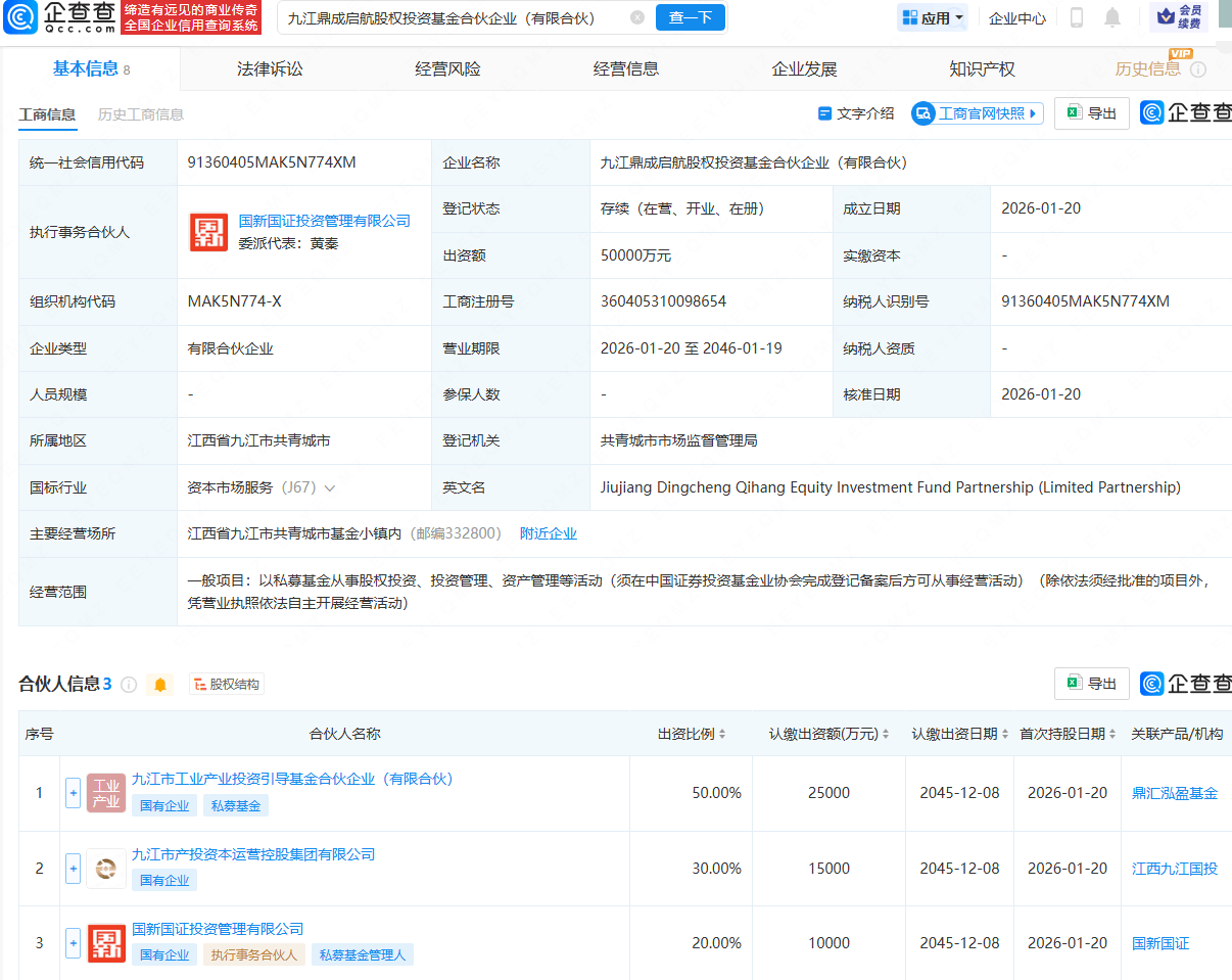 | 缔造有远见的商业传奇 | 全国企业信用查询系 | 九江鼎成启航股权投资基金合伙企业(有限合伙) | × 音一下 | | ■ 应用 ▼ | 企业中心 0 | | --- | --- | --- | --- | --- | --- | --- | | 基本信息 8 | 法律诉讼 经营风险 | | 经营信息 | 企业发展 | 知识产权 | | | 历史工商信息 工商信息 | | | | 国 文字介绍 | La 工商官网快照▶ | 國 导出 | | 统一社会信用代码 | 91360405MAK5N774XM | 企业名称 | 九江鼎成启航股权投资基金合伙企业(有限合伙) | | | | | 执行事务合伙人 | 国新国证投资管理有限公司 | 登记状态 | 存续(在营、开业、在册) | 成立日期 | | 2026-01-20 | | | 委派代表:黄泰 | 出资额 | 50000万元 | 实缴资本 | | | | 组织机构代码 | MAK5N774-X | 工商注册号 | 360405310098654 | 纳税人识别号 | | 91360405MAK5N | | 企业学习 | 有限合伙企业 | 营业期限 | 202 ...