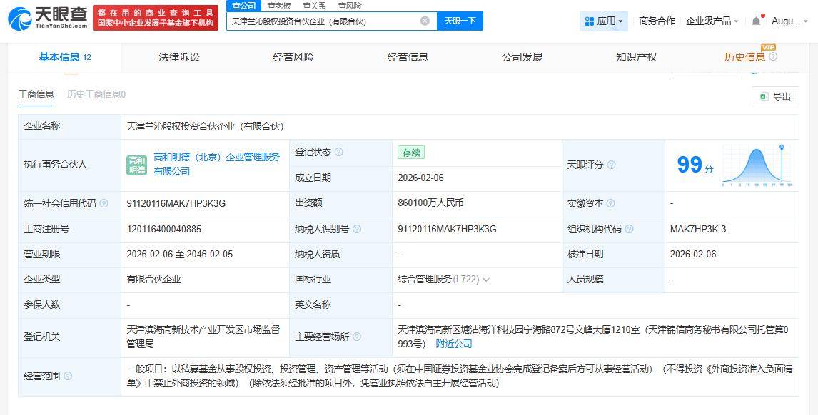 公司基本信息 - 公司名称为天津兰沁股权投资合伙企业(有限合伙),是一家有限合伙企业,登记状态为存续 [1] - 公司成立于2026年2月6日,营业期限至2046年2月5日,由天津滨海高新技术产业开发区市场监督管理局登记 [1] - 公司执行事务合伙人为高和明德(北京)企业管理服务有限公司 [1] - 公司注册地址为天津滨海高新区塘沽海洋科技园宁海路872号文峰大厦1210室(天津锦信商务秘书有限公司托管第993号) [1] - 公司统一社会信用代码为91120116MAK7HP3K3G [1] 公司资本与经营范围 - 公司出资额为860,100万人民币(即86.01亿元人民币) [1] - 公司经营范围是以私募基金从事股权投资、投资管理、资产管理等活动,须在中国证券投资基金业协会完成登记备案后方可经营 [1] 公司股东结构 - 公司合伙人包括多家知名保险机构,具体有泰康人寿保险有限责任公司、长城人寿保险股份有限公司、友邦人寿保险有限公司、中宏人寿保险有限公司、中意人寿保险有限公司、中美联泰大都会人寿保险有限公司、泰康养老保险股份有限公司 [1] - 执行事务合伙人高和明德(北京)企业管理服务有限公司以及卓领盛企业管理服务(上海)有限公司、Orchid LP HK Limited 亦在合伙人名单中 [1]