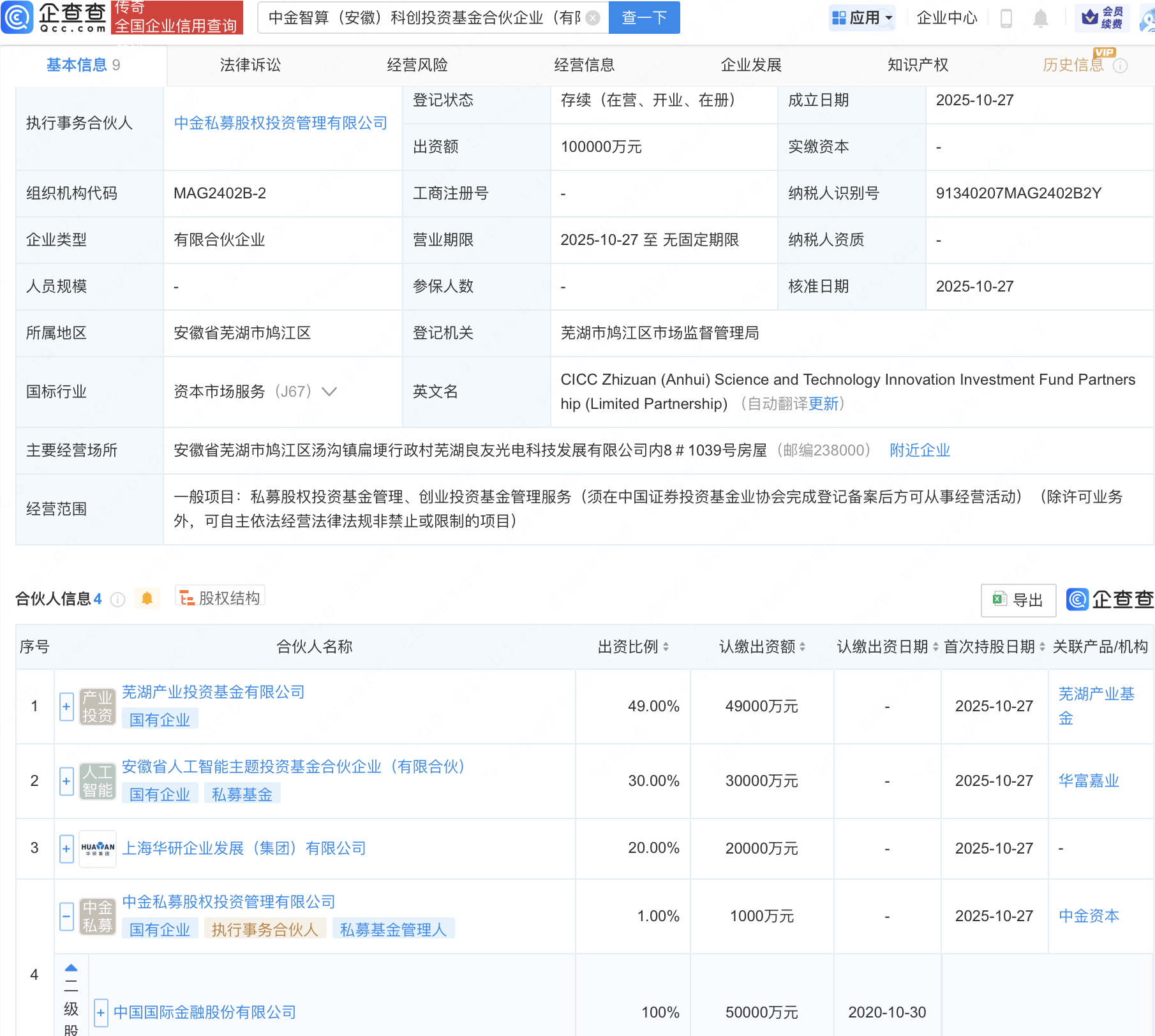 | 序号 | | | 合伙人名称 | 出资比例 ⇒ | | --- | --- | --- | --- | --- | | 1 | + | | 芜湖产业投资基金有限公司 | 49.00% | | | | | 国有企业 | | | 2 | + | | 安徽省人工智能主题投资基金合伙企业(有限合伙) | 30.00% | | | | 智能 | 国有企业 私募基金 | | | 3 | + | HUAVAN | 上海华研企业发展(集团)有限公司 | 20.00% | | | | 中金 | 中金私募股权投资管理有限公司 | 1.00% | | | | 私募 | 国有企业 执行事务合伙人 私募基金管理人 | | | ব | | | | | T 企查查APP显示,近日,中金智算(安徽)科创投资基金合伙企业(有限合伙)成立,出资额10亿元,经营范围包含:私募股权投资基金管理、创业投资基 金管理服务。企查查股权穿透显示,该企业由中金公司(601995)全资子公司中金私募股权投资管理有限公司等共同出资。 | | 全国企业信用查询 | 中金智算(安徽)科创投资基金合伙企业(有β ◎ | 奋一下 | | --- | --- | -- ...
