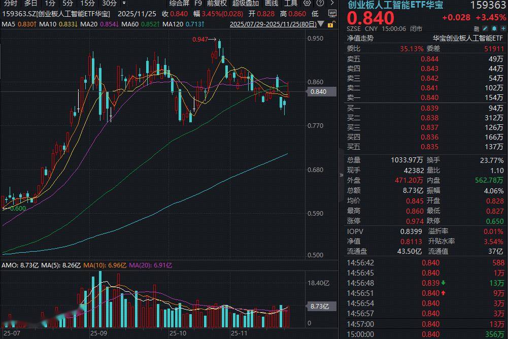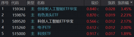 11月25日,AH携手走强,沪指盘中涨逾1%,为月内首次;创业板指一度收复3000点大关,收盘涨近 2%。市场热度迅速回升,全市场近4300股上涨,两市成交额1.81万亿元,环比放量。 | 序号 代码 类型 名称 | 现价 涨跌 涨跌幅 ▼ | | --- | --- | | 1 159363 主 创业板人工智能ETF华宝 0.840 c 0.028 3.45% | | | 2 159876 主 有色龙头ETF | 0.870 c 0.019 2.23% | | 3 589520 主 科创人工智能ETF华宝 0 0.566 c 0.012 2.17% | | | 4 515260 主 电子ETF | 0.612 c 0.012 2.00% | | 5 515000 主 科技ETF | 0.917 c 0.017 1.89% | AI主线高调回归,硬件和应用端齐发力!双线布局"算力+AI应用"的创业板人工智能ETF(159363)场 内价格一度涨近6%,领跑同类,收盘仍大涨3.45%;重仓国产AI产业链的科创人工智能ETF(589520) 场内价格收涨逾2%。 港股AI同步上攻,全市场首只聚焦"港股芯片"产业链 ...