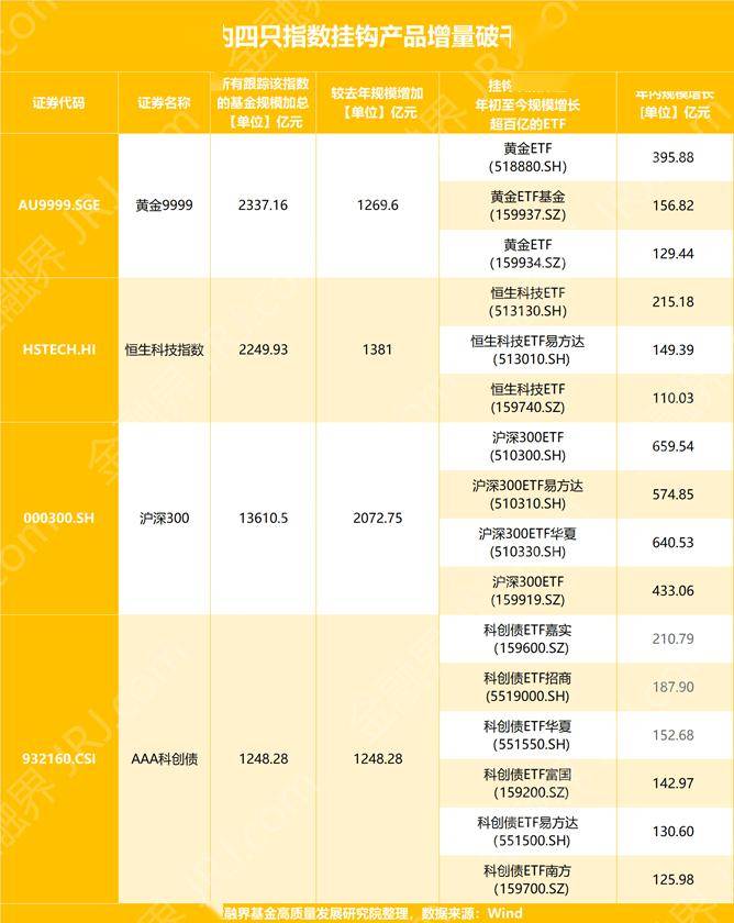 今年以来,ETF市场扩容显著提速,少数核心指数挂钩产品的规模增长尤为突出。 4只千亿增量指数浮现 年内ETF市场延续扩容态势,资金持续流入推动整体规模稳步抬升。数据显示,截至12月12日,今年以来全市场ETF规模增量已超过2万亿元,在权益、债券、商品 及跨境等多个方向均有体现,ETF作为重要资产配置工具的吸引力不断增强。 在整体扩容的背景下,部分指数对应ETF产品的规模增长尤为突出。券商中国记者注意到,今年以来,有4个指数挂钩的ETF产品合计规模增量均超过1000亿元,分 别为中证AAA科技创新公司债指数(AAA科创债指数)、沪深300指数、SGE黄金9999指数以及恒生科技指数。 数据显示,截至12月12日,全市场ETF的年内规模增量已超过2万亿元。在此背景下,科创债、沪深300、黄金及恒生科技等四类指数挂钩ETF,年内规模增量均突 破1000亿元,成为ETF扩容过程中最具代表性的结构性样本。 其中,AAA科创债ETF的规模增长约1992亿元,沪深300ETF的规模增加约1935亿元,黄金ETF的规模增长约1476亿元,恒生科技ETF的规模增量约1138亿元。尽管 相关指数所处市场与风险属性各不相同,但均在 ...
