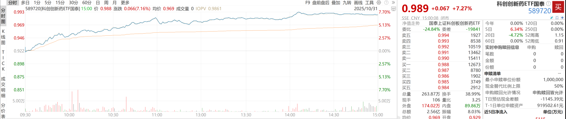 每经编辑|彭水萍 10月31日,A股震荡走低,前期强势的科技龙头股普遍回调,小盘股迎来反弹行情,市场逾3700股上涨。上证指数收跌0.81%报3954.79点,深证成指跌 1.14%,创业板指跌2.31%,北证50涨1.89%,科创50跌3.13%,万得全A跌0.52%,万得A500跌1.4%,中证A500跌1.24%。A股全天成交2.35万亿元,上日成 交2.46万亿元。 科创创新药ETF(589720)单日涨幅达7.27% 2.中期看临床里程碑:下一个关键节点将是这些进入全球后期临床的产品的数据读出,成功的"头对头"数据有望带动管线估值上修,或有望成为价值再次飞 跃的催化剂. 一、上涨驱动因素分析 消息面上,2025年10月31日,辉瑞正式登记启动三生制药旗下PD-1/VEGF双抗(代号:707)的两项全球多中心III期临床研究,针对非小细胞肺癌和结直肠 癌的一线治疗,并采用"头对头"设计直接挑战当前标准疗法(K药和贝伐珠单抗),本次两项III期是辉瑞为SSGJ707开启的首两个临床。本次事件的深远意 义在于,代表了中国创新药出海模式从"授权转让(License-out)"向"全球MNC巨头主导并投入重金 ...