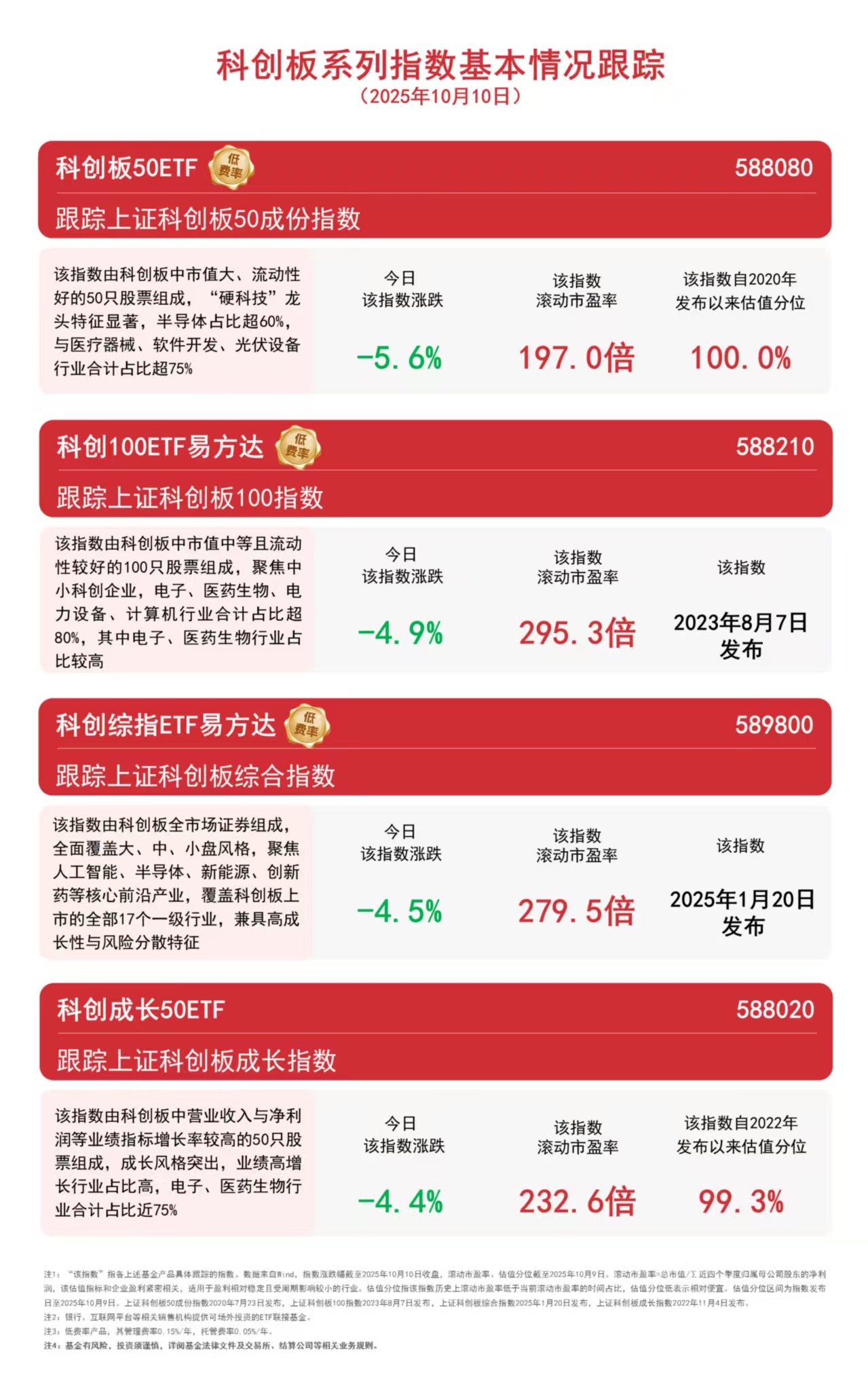 今日,半导体、创新药板块集体回调,光伏设备、电池等新能源赛道情绪低迷。截至收盘,科创成长指数下跌4.4%,科创综指下跌4.5%,科创100指数下跌 4.9%,科创板50指数下跌5.6%。 科创板50ETF(588080)今日发布首次分红公告,投资者每持有10份基金份额可获得0.14元分红,权益登记日为10月16日,除息日为10月17日,现金红利发 放日为10月22日。 科创成长50ETF 跟踪上证科创板成长指数 该指数由科创板中营业收入与净利 润等业绩指标增长率较高的50只股 票组成,成长风格突出,业绩高增 长行业占比高,电子、医药生物行 业合计占比近75% 令日 该指数涨跌 该指数 滚动市盈率 该指数自 发布以来 232. 6倍 99 注1 - "波指取"指名上述基金产品具体假踪的指数。数据来自制ind,按数涨跌幅段至205年10月10日收盘,深动市盈率、估值分位载至2025年10月9日,澳动市盈军=总市位/汇近四个年便J 润,该估值拥标和企业盈利紧密相关,适用于盈利相对稳定且受周期影响较小的行业。估值分位指该指数历史上滚动市盈率低于当前滚动市盈率的时间占比,估值分位使表示相对便宜。 估1 日至2025年1 ...
