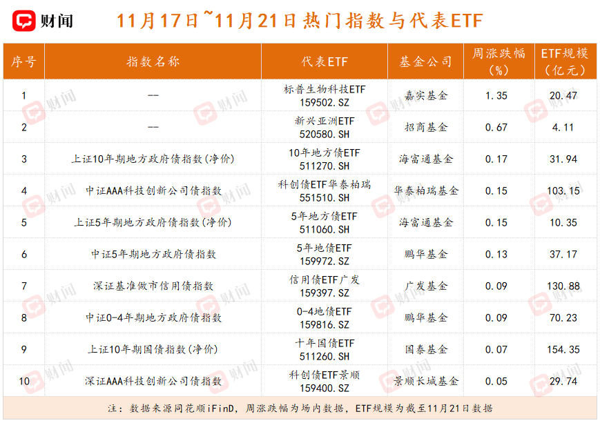 上周(11月17日至11月21日),A股市场整体经历显著调整,上证指数全周始终运行于4000点下方,累计下跌3.9%。其中, 11月21日(周五),指数失守3900点关口,单日跌幅达2.45%,成为"黑色星期五"。 深市表现更为疲弱,深证成指全周下跌5.13%,创业板指跌幅达6.15%。港股市场同样承压,恒生指数当周跌幅超过5%。 受此影响,上周,全市场股票型ETF全线下跌。 其中受光伏、锂电等新能源领域大幅调整的影响,23只相关ETF跌幅超10%,其中科创板新能源ETF(588960.SH)和科创新 能源ETF(588830.SH)领跌,单周跌幅分别高达13.44%和13.17%。仅有8只股票型ETF单周跌幅小于1%,传媒ETF、银行 ETF及创业板人工智能ETF在当前市场环境下展现出较强的抗跌属性。 整体来看,全市场仅有52只ETF实现上涨。 其中,单周上涨1.35%的标普生物科技ETF(159502.SZ)成为上周全市场唯一一只涨幅超过1%的ETF产品。在涨幅靠前的 ETF中,频繁出现地方债和科创债相关产品的身影。 | 序号 | 指数名称 | 代表ETF | 基金公司 | 周涨跌幅 | ETF规模 | ...