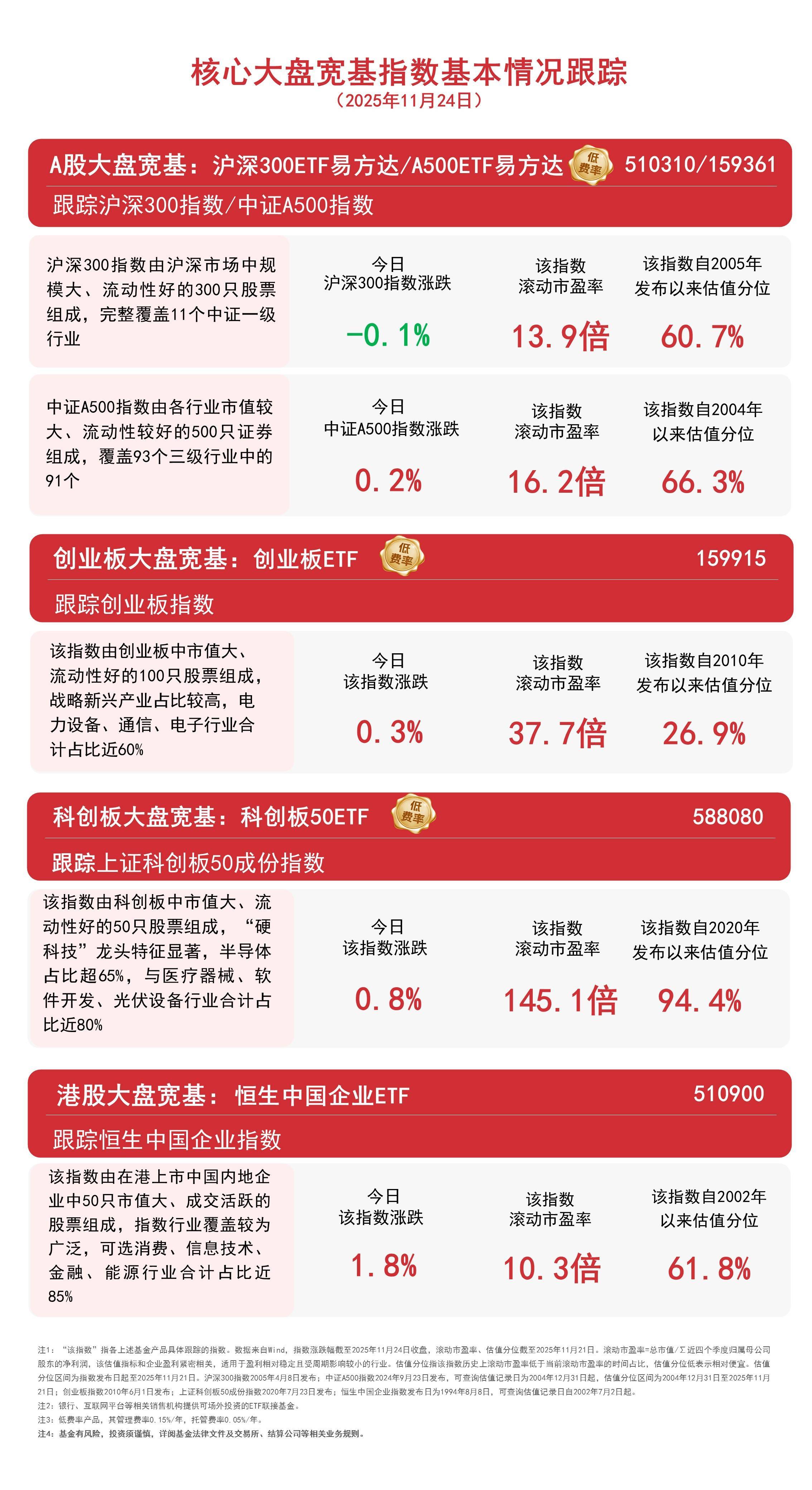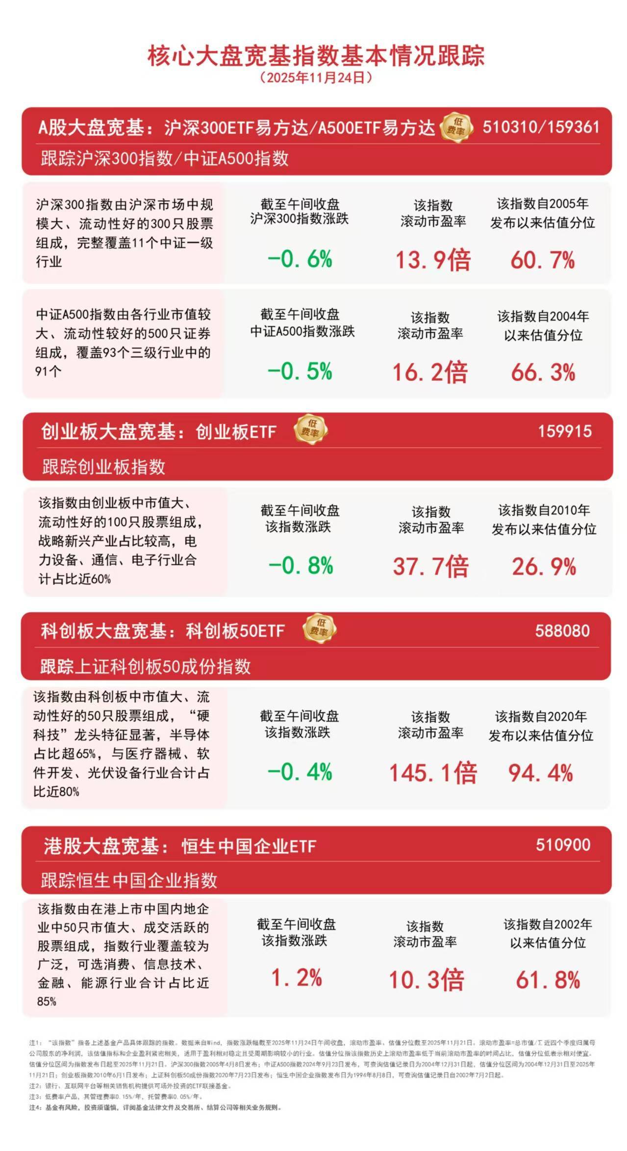 市场早盘高开低走,沪指跌0.3%,板块题材上,商业航天等板块涨幅居前,能源金属、磷化工、煤炭等板块集体调整;港股全线反弹,创新药、互联网, 新能源车等板块均有亮服表现。截至午间收盘,中证4.500指数下跌0.5%,沪深300指数下跌0.6%,创业板指数下跌0.8%,上证科创板50成分指数下跌 0.4%,恒生中国企业指数上涨1.2%。 核心大盘宽基指数基本情况跟踪 (2025年11月24日) A股大盘宽基:沪深300ETF易方达/A500ETF易方达 (9) 510310 跟踪沪深300指数/中证A500指数 | 沪深300指数由沪深市场中规 | 截至午间收盘 | 该指数 | 该指数 | | --- | --- | --- | --- | | 模大、流动性好的300只股票 | 沪深300指数涨跌 | 滚动市盈率 | 发布以求 | | 组成,完整覆盖11个中证一级 行业 | -0. 6% | 13.9倍 | 60 | | 中证A500指数由各行业市值较 | 截至午间收盘 | 该指数 | 该指数 | | 大、流动性较好的500只证券 | 中证A500指数涨跌 | 滚动市盈率 | 以来仁 | | 组成,覆盖93个三级 ...