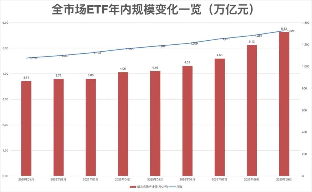 据Wind数据统计,截至9月30日,全市场ETF总规模达到5.63万亿元。其中,股票ETF总规模突破3.7万亿元,债券ETF规模突破6900亿元,均创历史新 高。 多位业内人士表示,万亿元级增量的背后,是保险、年金、养老金等机构资金以及个人投资者通过ETF工具进行布局,ETF凭借分散、透明、高效的特 质,正成为匹配居民财富管理需求、推动长期投资理念的重要载体。 ETF总规模达到5.63万亿元,创出历史新高 在场内资金不断涌入下,ETF总规模再创历史新高。 Wind数据显示,截至9月30日,全市场ETF总规模达5.63万亿元。其中,股票ETF总规模突破3.7万亿元,债券ETF规模突破6900亿元,均创历史新高。 今年以来,全市场ETF份额增加3627.81亿份,最新份额达到3万亿份,年内增幅达到13.72%;ETF总规模增长1.84万亿元,年内增幅为48.47%。 分类型看,今年以来,股票ETF规模增长8208.23亿元,是规模增长最多的细分ETF类型。从规模增速上看,债券ETF规模增长接近3倍,为增速最快的ETF 细分类型。此外,商品ETF、跨境ETF规模增速也均超过100%。 伴随着A股市场节节攀升,ETF ...