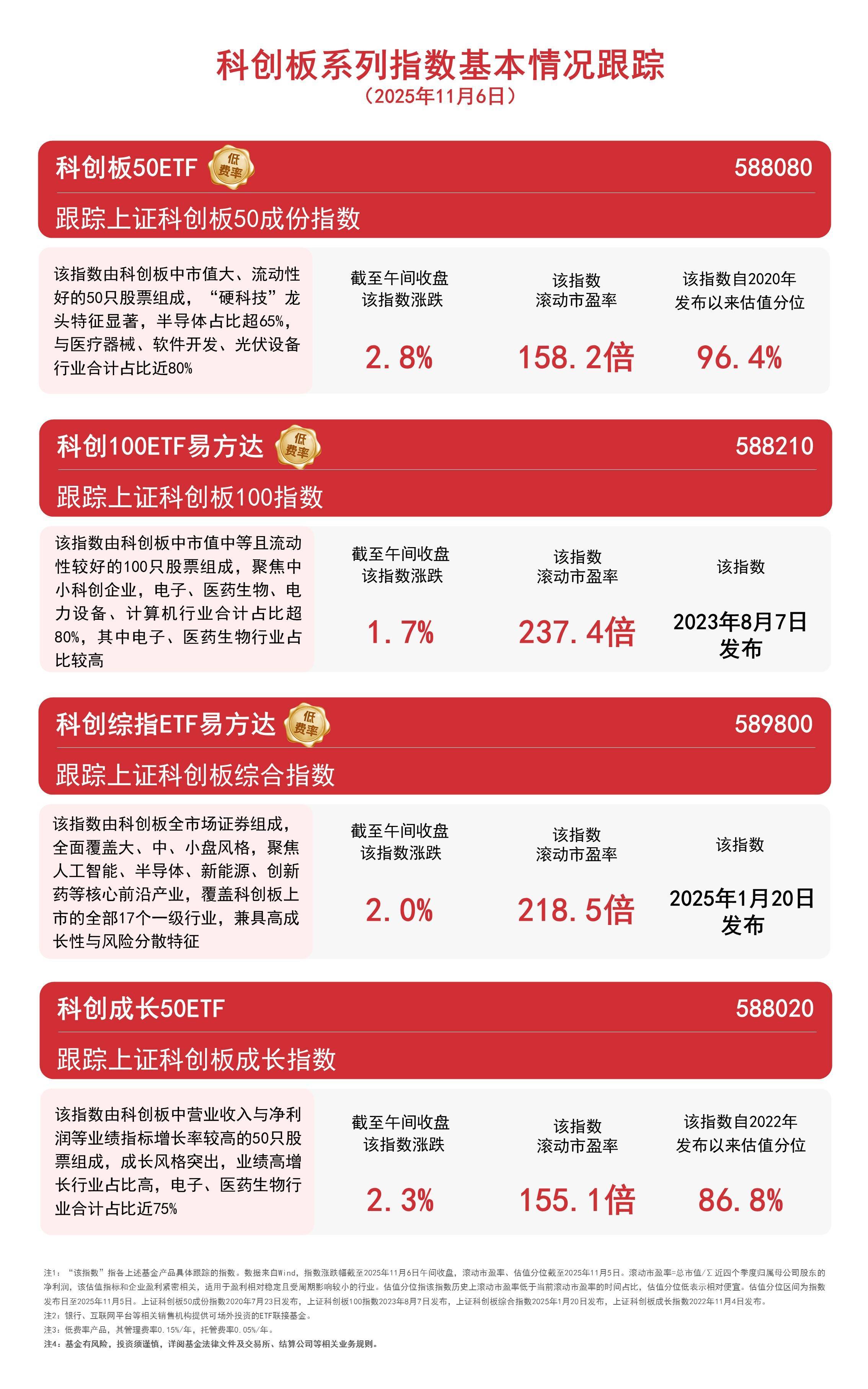 跟踪上证科创板50成份指数 科创板50ETF 1 该指数由科创板中市值大、流动性 好的50只股票组成,"硬科技"龙 头特征显著,半导体占比超65%, 与医疗器械、软件开发、光伏设备 行业合计占比近80% | 截至午间收盘 | 该指数 | | --- | --- | | 该指数涨跌 | 滚动市盈利 | | 2% | 159 . 3 | 今日早盘,科创板个股走势分化,半导体相关概念股逆势活跃,截至午间收盘,科创板50指数下跌0.2%,科创成长指数下跌0.5%,科创宗指下跌1.1%,科 创100指数下跌1.4%。 Wind数据显示,截至昨日,科创板50ETF(588080)连续4个交易日获资金净流入,合计超5亿元。 科创板系列指数基本情况J (2025年11月4日) 该指数由科创板全市场证券组成, 今而碧羊十 中 小舟冈枚 娶年 截至午间收盘 该指数 科创100ETF易方达 跟踪上证科创板100指数 该指数由科创板中市值中等且流动 性较好的100只股票组成,聚焦中 小科创企业,电子、医药生物、电 力设备、计算机行业合计占比超 80%,其中电子、医药生物行业占 比较高 | 截至午间收盘 | 该指数 | | --- | ...