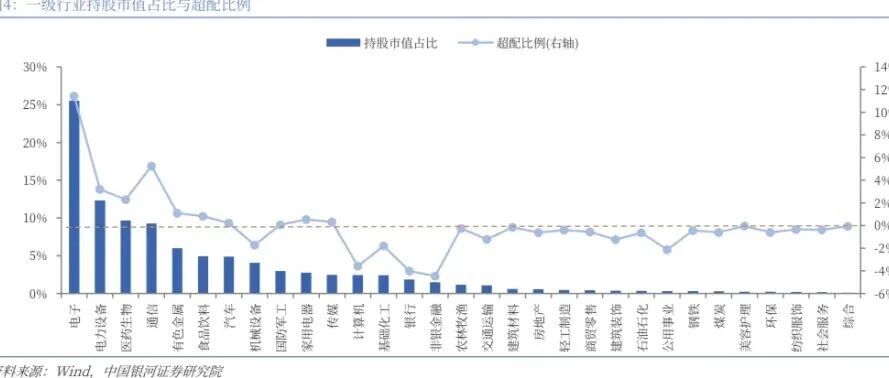 最近三季报数据都出炉啦。各家策略也都做了详细的统计。有业绩的,有持仓的。今天重点给大家讲讲AI水位。 三季报看,电子、通信行业占比很高 不能说毫不相关,但也可以看出排名首末对调吧。 一季度末通信倒数第二,现在顺数第二。汽车从第一变为第七,计算机从顺数第七变到13。 环比看,电子持仓涨的最多(6.86%)、通信(3.93%)、电力设备(2.43%)、有色金属(1.35%)、传媒(0.55%)行业占比上涨超0.5个百分点。 从板块看,双创持仓明显上涨!这个季度创业 板的配置比例由18.93%上升至23.62%,上升了4.70个百分点,科创板的配置比例也上升了2.07个百分点。 持股市值占比来看,最新财报电子(25.53%)、电力设备(12.32%)、医药生物(9.66%)、通信(9.26%)、有色金属(6%)行业占比位于前列,而综合(0.1%)、社会 服务(0.18%)、纺织服饰(0.21%)、环保(0.24%)、美容护理(0.24%)行业占比处于相对低位。 持股市值占比与该行业在A股市场中的自由流通市值占比,计算超配比例,2025年第三季度,电子(11.43%)、通信(5.26%)、电力设备(3.2%)、医药生 ...