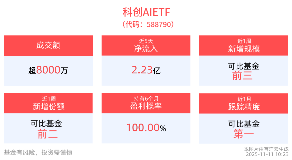 上证科创板人工智能指数及科创AIETF表现 - 截至2025年11月11日10:23,上证科创板人工智能指数下跌0.36% [3] - 指数成分股涨跌互现,威胜信息领涨5.08%,福昕软件上涨3.06%,凌云光上涨2.25%;寒武纪领跌2.34%,奥普特下跌2.28%,中科星图下跌1.65% [3] - 科创AIETF(588790)下跌0.26%,最新报价0.77元 [3] - 截至2025年11月10日,科创AIETF近3月累计上涨22.54% [3] - 科创AIETF盘中换手率为1.43%,成交金额为8689.81万元 [3] - 截至11月10日,科创AIETF近1年日均成交额为3.98亿元,居可比基金第一 [3] - 科创AIETF近1周规模增长2994.99万元,新增规模位居可比基金第三 [4] - 科创AIETF近1周份额增长1.77亿份,新增份额位居可比基金第二 [4] - 科创AIETF最新资金净流入4627.19万元 [5] - 近5个交易日内有4日资金净流入,合计净流入2.23亿元,日均净流入达4453.06万元 [5] 科创AIETF跟踪指数及成分股 - 科创AIETF紧密跟踪上证科创板人工智能指数 [5] - 上证科创板人工智能指数从科创板市场选取30只为人工智能提供基础资源、技术及应用支持的市值较大上市公司证券作为样本 [5] - 截至2025年10月31日,指数前十大权重股包括澜起科技、金山办公、寒武纪等,合计占比70.92% [5] 行业动态与公司融资 - 湃特纳机器人宣布完成数千万元A轮融资,由华创资本领投,老股东同创伟业、红点创投追加投资 [3] - 融资资金将主要用于产品研发和海外市场推广 [3] - 加上2024年底完成的天使轮融资,湃特纳已完成两轮累计近亿元人民币的融资 [3] 国际科技巨头AI投资 - 美国科技巨头Meta发布公告,确认将于2028年前在美国投资6000亿美元,用于建造人工智能数据中心和人才招募等 [4] - 过去两个月,Meta披露了在得克萨斯州埃尔帕索、阿拉巴马州蒙哥马利和密苏里州堪萨斯城建设或扩建数据中心的计划 [4] - 公司正在与各地公用事业公司合作,获取运行数据中心所需的水电资源 [4] - 公司表示已通过直接投资为美国各地电网新增15GW的能源 [4] 行业研究与观点 - 中信建投研报指出,AI大模型的用户渗透率仍较低,大模型带来的算力投资方兴未艾 [4] - 研报持续推荐AI算力板块,包括北美算力产业链与国内算力产业链的核心公司 [4] - 研报建议关注AI应用板块,包括端侧AI的进展 [4]