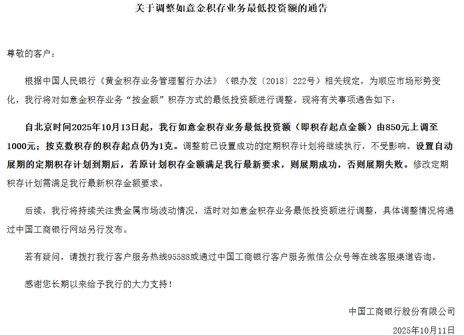 11 月 3 日,工商银行发布关于暂停受理部分如意金积存业务申请的公告。 【导读】工商银行: 11 月 3 日起暂停受理部分如意金积存业务申请 中国基金报记者 李智 自 2025 年 11 月 3 日起, 工商银行暂停受理如意金积存业务的开户、主动积存、新增定期 积存计划以及提取实物的申请 。 工行暂停受理部分如意金积存业务申请 受宏观政策影响,根据工商银行风险管理要求,自 2025 年 11 月 3 日起,该行暂停受理如 意金积存业务的开户、主动积存、新增定期积存计划以及提取实物的申请,存量客户处于有 效期内的定期积存计划的执行以及办理赎回、销户不受影响。 10 月 11 日,工商银行曾宣布调整如意金积存业务最低投资额。自北京时间 2025 年 10 月 13 日起,工商银行如意金积存业务最低投资额(即积存起点金额)由 850 元上调至 1000 元;按克数积存的积存起点仍为 1 克。 今年以来,工商银行曾多次发布关于防范贵金属价格波动风险的提示。 10 月 15 日,工商银行公告称,近期影响市场不稳定的因素持续增加,贵金属价格波动剧 烈。建议投资者关注市场变化,增强风险防范意识,基于自身的财务状况和风险承 ...