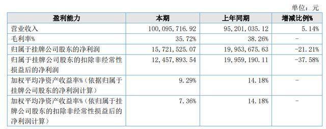 瑞财经 钟鸣辰近日,红一种业(NQ838103)发布2024年年度报告,去年增收不增利。 | | | | 单位: 元 | | --- | --- | --- | --- | | 盈利能力 | 本期 | 上年同期 | 增减比例% | | 营业收入 | 100.095. 716. 92 | 95.201.035.12 | 5.14% | | 毛利率% | 35.72% | 38. 26% | - | | 归属于挂牌公司股东的净利润 | 15,721,525.07 | 19. 953, 675. 63 | -21. 21% | | 归属于挂牌公司股东的扣除非经常性 | 12, 457, 893. 54 | 19, 959, 190. 11 | -37.58% | | 灰益后的净利润 | | | | | 加权平均净资产收益率%(依据归属于 | 9.29% | 14. 18% | | | 挂牌公司股东的净利润计算) | | | | | 加权平均净资产收益率%(依归属于挂 | 7. 36% | 14. 18% | | | 牌公司股东的扣除非经常性损益后的 | | | | | 净利润计算) | | | | 报告期间,红一种 ...