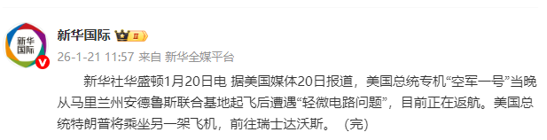 事件概述 - 美国总统专机“空军一号”于1月20日起飞后不到一小时即返航 [1] - 白宫方面称飞机遭遇轻微电路问题,出于谨慎起见返回安德鲁斯联合基地 [1] - 记者表示媒体舱灯光曾短暂熄灭,但白宫方面未对此给出解释 [1] - 特朗普总统随后乘坐另一架飞机前往瑞士达沃斯出席世界经济论坛年会 [1]