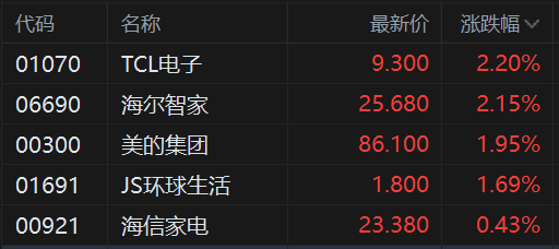 有分析指,AI、5G与物联网技术融合,叠加政策扶持与消费需求升级,智能家居行业正迈入规模化发 展阶段。结合各权威调研机构给出的数据也显示,全球智能家居市场规模高达千亿美元。(格隆汇) | 代码 | 名称 | | 最新价 涨跌幅 v | | --- | --- | --- | --- | | 01070 | TCL电子 | 9.300 | 2.20% | | 06690 | 海尔智家 | 25.680 | 2.15% | | 00300 | 美的集团 | 86.100 | 1.95% | | 01691 | 1S环球生活 | 1.800 | 1.69% | | 00921 | 海信家电 | 23.380 | 0.43% | 消息上,广东省人民政府办公厅日前发布关于印发《"粤享暖冬 乐游广东"消费季活动总体方案》的通 知。其中提到,活动期间,发放"广东优品购"消费券,对个人消费者购买新能源乘用车或符合国六排放 标准燃油乘用车新车,购买电视机、冰箱、空调(含取暖器)、电脑(含显示器)、洗衣机、扫地机器 人、家用灶具(含吸油烟机)、热水器等8类家电产品。 港股家电股普遍上涨,其中,TCL电子、海尔智家涨2.2%,美的 ...