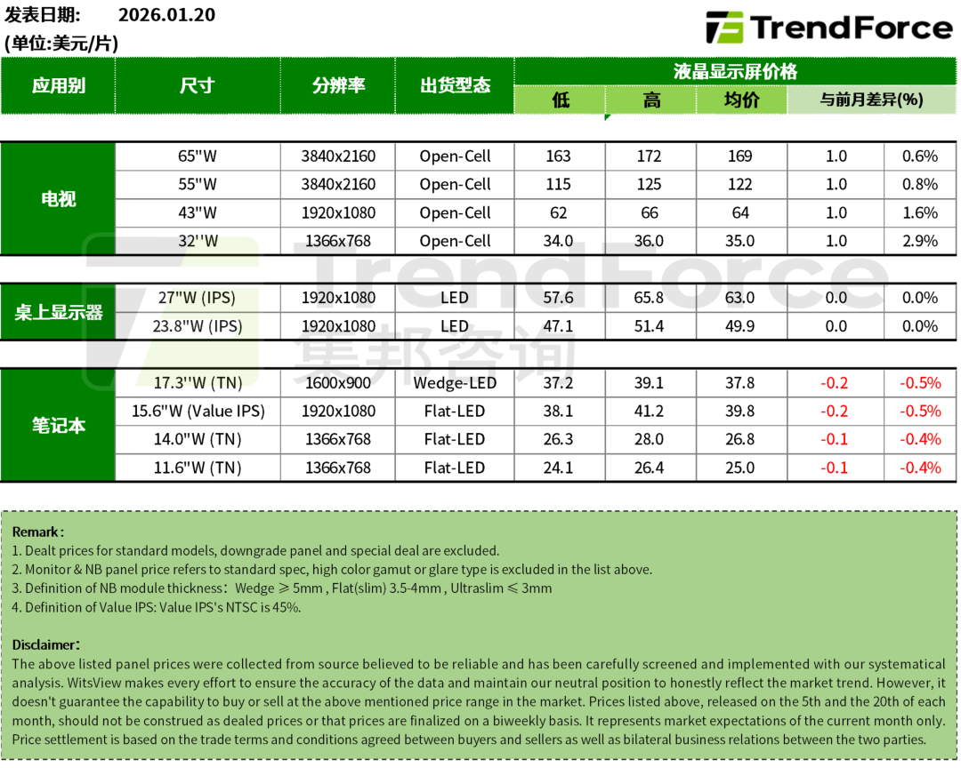 2026年1月面板价格趋势总结 - 核心观点:2026年1月,不同应用类别的液晶面板价格呈现分化趋势,电视面板价格在传统淡季转为上涨,显示器面板价格持稳,而笔记本电脑面板价格则继续下跌[1] 电视面板价格分析 - 1月份电视面板价格整体转为上涨,32英寸、43英寸、55英寸与65英寸面板均调涨1美元[3] - 具体价格变动:55英寸4K Open-Cell均价169美元,较前月上涨0.6%;43英寸FHD Open-Cell均价122美元,上涨0.8%;32英寸HD Open-Cell均价35美元,上涨2.9%[2] - 价格上涨原因:尽管面临零部件涨价冲击,部分主力电视品牌客户为抢占市场份额,在第一季传统淡季仍积极备货,需求不弱[3] - 供应端因素:面板厂计划在2月份进行相应减产,使得整体电视面板供需处于平衡状态,有利于价格在第一季迎来涨势[3] 显示器面板价格分析 - 1月份显示器面板模组价格维持持平态势,例如27英寸IPS模组均价63美元,23.8英寸IPS模组均价49.9美元,均与前月无变化[2][5] - 需求端变化:在零部件持续涨价的趋势下,部分品牌客户为控制采购成本,一反传统淡季常态,提前备货需求转强[4] - 价格前景:Open cell面板有望率先调价,主流尺寸如23.8英寸IPS与27英寸IPS预计调涨0.1~0.2美元,电视面板价格上涨为显示器面板营造了涨价氛围[5] 笔记本电脑面板价格分析 - 1月份笔记本电脑面板价格维持下跌趋势,其中TN机种预估下跌0.1美元,IPS机种预估下跌0.2美元[6] - 具体价格变动:17.3英寸TN面板均价37.8美元,下跌0.5%;15.6英寸Value IPS面板均价39.8美元,下跌0.5%;14.0英寸TN面板均价26.8美元,下跌0.4%[2] - 需求与价格博弈:尽管内存涨价促使笔记本品牌客户在第一季度积极备货以扩大出货量,并增加了面板需求,但同时要求面板厂在价格上作出让步[6] - 面板厂策略:面板厂虽感受到需求增强,但为维持客户关系并考虑第二季度后的需求不确定性,在价格谈判上姿态放软[6]