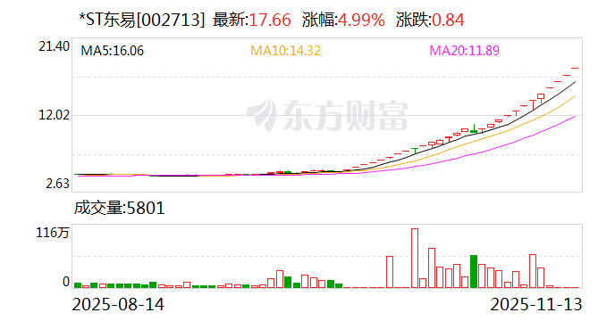 【导读】*ST东易将自11月14日开市起停牌核查 11月13日晚间,*ST东易(证券代码:002713)发布公告称,公司股票自9月26日晚披露《关于遴选重整投资人结果及签署重整投资协议暨预重整进展的 公告》以来,至11月13日价格涨幅为241.59%,其间出现9次异常波动,严重背离公司基本面,公司将就股票交易波动情况进行核查。 经申请,*ST东易股票将自11月14日开市起停牌,待核查结束并披露相关公告后复牌,预计停牌时间不超过3个交易日。 回溯来看,*ST东易此次股价走牛与其预重整取得重大进展密切相关。因产业投资人拟向公司无偿捐赠和林格尔智算中心,市场预期公司将注入算力产业 业务。 自9月29日以来,*ST东易在28个交易日取得23个涨停。截至11月13日,公司股价报17.66元/股,总市值为74.09亿元。 预重整进展带动股价走牛 *ST东易的股价狂欢始于预重整进展带来的希望。 9月26日晚间,公司披露了《关于遴选重整投资人结果及签署重整投资协议暨预重整进展的公告》,随后股价便开启了"疯涨"模式。 根据公告,*ST东易已与多家重整投资人签订了协议书。截至目前,已收到重整投资人全部重整投资款/履约保证金合计1 ...