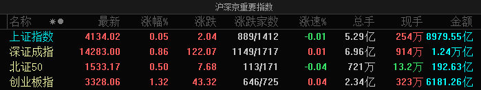 市场整体表现 - 三大指数集体收涨,创业板指涨1.32%,科创50指数涨超1%,深成指涨0.86%,沪指微涨0.05% [1] - 市场成交额显著放大,沪深两市成交额达2.14万亿元,较上一交易日增加1575亿元 [1][6] - 市场呈现分化格局,全市场超3200只个股下跌,微盘股指数跌超1% [1] - 上证指数收报4134.02点,深证成指收报14283.00点,创业板指收报3328.06点,北证50指数收报1533.17点,涨0.50% [2] 行业与板块表现 - 算力产业链集体爆发,算力租赁概念走强,大位科技4连板,首都在线、优刻得20cm涨停 [2] - CPO概念快速拉升,天孚通信、罗博特科均续创历史新高 [2] - 算力芯片概念午后走高,芯原股份大涨超10% [2] - 液冷服务器概念表现活跃,川润股份4天2板,大元泵业涨停 [2] - 电网设备概念集体走强,思源电气、四方股份均创新高,望变电气、顺钠股份涨停 [2] - 大消费板块集体走弱,影视院线、旅游酒店、零售、食品饮料等板块跌幅居前,横店影视、海欣食品跌停 [3] 市场交易与情绪数据 - 两市上涨家数2108家,下跌家数3280家,持平96家 [4] - 市场涨停家数69家,跌停家数22家 [4] - 市场热度指标为35 [5] - 涨停个股封板率为76.00%,昨日涨停个股今日平均表现2.66% [6]