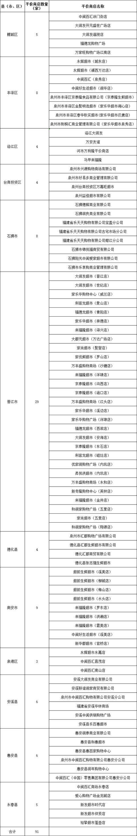 平价销售机制启动 - 泉州市发改委正式启动2026年春节、元宵平价商品销售机制 旨在保障节日期间民生商品供应充足、价格平稳 守护市民的“菜篮子”和“米袋子” [1] - 本次平价销售从2月9日起至3月3日结束 为期23天 [1] - 销售商品涵盖粮、油、肉、蛋、菜、水果六大类共17个品种 所有商品均严格按对应等级标准保质供应 [1] 参与规模与商店分布 - 全市共有91家平价商店同步参与本次平价销售 [1][5] - 平价商店布局覆盖各地主要商圈、居民集聚区 方便市民就近选购 [6] - 从分布看 晋江市参与商店数量最多 达29家 其次是石狮市和丰泽区 分别为8家 鲤城区5家 洛江区4家 台商投资区、南安市、安溪县、惠安县、永春县、泉港区等地均有商店参与 [3][4][5] 运营与监管措施 - 发改部门将强化价格动态监测与市场常态化巡查 安排专人每日跟踪平价商品价格、销量等情况 [6] - 相关部门将及时纠正质价不符等问题 以保障商品质优价稳 [6] - 各平价商店需按要求每日上报销售数据 实现销售全程可追溯 [6] - 平价销售结束后 相关部门将按规定及时核实并拨付销售价差补贴 [6]