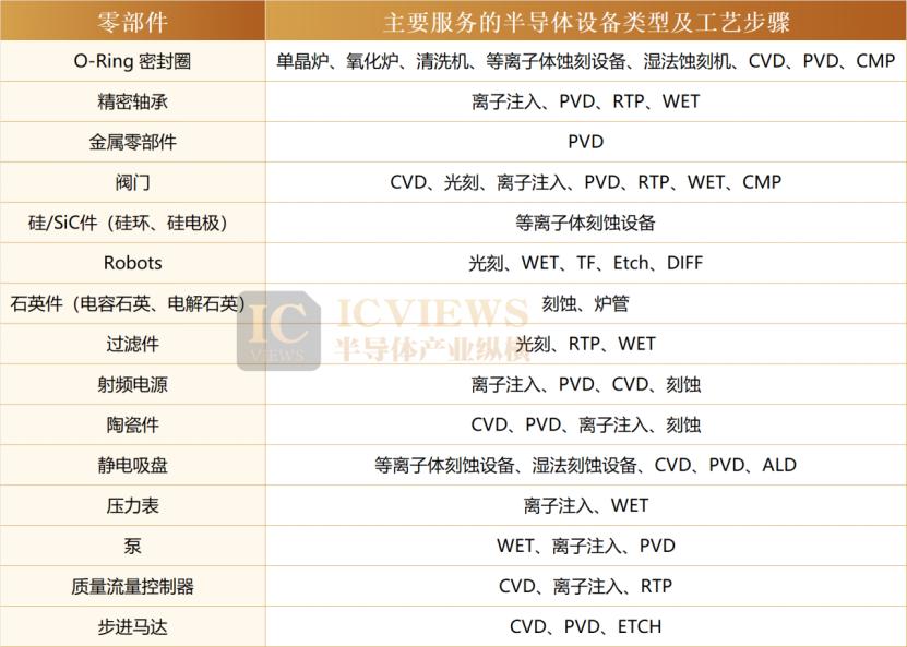 半导体核心零部件的战略地位与产业特征 - 零部件是半导体设备制造的核心基石,其性能、质量与精度直接决定设备的可靠性和稳定性,是半导体产业向高端化跃升的关键支撑[1] - 半导体设备零部件产业具有高技术密集、多学科交叉融合、市场规模占比小且分散但价值链地位举足轻重等鲜明特征[3][4] - 设备零部件支出通常占设备总价值的50%至80%,其中关键零部件支出占比极高,以刻蚀机为例,10种主要关键零部件支出占设备总零部件支出的85%左右[3][5] 半导体设备与关键零部件分类 - 半导体设备(集成电路装备)涵盖芯片制造与封测流程中应用的设备,涉及上千道工序,关键品类包括光刻、刻蚀、薄膜沉积、热处理、湿法、化学机械研磨、离子注入、量测等8大类上百种机台[2][4] - 关键零部件种类繁多,服务于不同设备和工艺步骤,包括但不限于O-Ring密封圈、精密轴承、阀门、硅/SiC件、机器人、石英件、射频电源、陶瓷件、静电吸盘、质量流量控制器等[3] 国内设备商推动核心零部件国产化布局 - **北方华创**:通过投资、自研等方式参与零部件研发,其控股子公司北京华丞电子聚焦半导体核心零部件研发与制造,覆盖流量测控、压力测控、射频电源、ESC电源、匹配器等,公司核心零部件国内采购比例逐年增加[5] - **晶盛机电**:子公司晶鸿精密以核心零部件国产化为目标,已成功拓展真空腔体、精密传动主轴、游星片、陶瓷盘等系列产品,公司还布局光伏石英坩埚、半导体石英坩埚、金刚线等业务[6] - **拓荆科技**:拟与沈阳市国资委等共同发起设立辽宁省集成电路装备及零部件创新中心,整合资源推动整机装备与零部件企业集聚发展[6] - **先导基电(原万业企业)**:依托垂直一体化技术,为凯世通定向开发静电吸盘、MFC、微波电源、高压电源等核心零部件,并计划构建原材料、零部件、设备、服务、回收全链条服务体系[7] - **精测电子**:通过子公司北京精测重点布局准分子激光器等半导体核心零部件领域[7] - **其他公司**:中微公司、华卓精科也已加码核心零部件布局[8] 核心零部件企业IPO与资本聚焦 - 半导体领域投资逻辑遵循“先投系统、再投设备、后投核心零部件”的路径,随着头部设备企业成型,资本开始向核心零部件赛道集中,一批企业加速启动上市进程[9] - **江苏扬州神州半导体科技股份有限公司**:2025年12月16日办理上市辅导备案,核心产品包括射频及脉冲电源、自动网络匹配器、远程等离子发生器等[9] - **重庆臻宝科技股份有限公司**:科创板IPO进入关键阶段,已实现硅、石英、碳化硅、陶瓷及工程塑料五大类零部件量产,构建“原材料+零部件+表面处理”一体化业务平台[10] - **强一股份**:2025年12月30日上市,被誉为“半导体探针卡第一股”,核心产品包括2D MEMS探针卡、薄膜探针卡,并积极布局存储领域探针卡[11] - **上海韬盛电子科技股份有限公司**:2025年12月30日科创板IPO申请获受理,专注半导体测试接口,已形成上百类测试探针和超4000种芯片测试接口技术方案,并布局MEMS探针卡业务[12] - **成都超纯应用材料股份有限公司**:2025年12月30日创业板IPO获受理,核心产品覆盖晶圆制造全产业链设备核心零部件,是国内极少数具备5nm及以下制程半导体刻蚀设备核心零部件供应能力的企业[13] - **江苏高凯精密流体技术股份有限公司**:2025年12月29日申报科创板IPO,是国内极少数能够量产供货且产品应用于先进工艺制程节点的半导体设备关键流体控制部件供应商,部分产品可应用于7nm及以下逻辑芯片先进制程[13] - **上海隐冠半导体**:2025年12月24日办理上市辅导备案,核心业务涵盖半导体零部件及子系统、精密光学部件、超精密整机制造等领域[14] - **深圳市恒运昌真空技术股份有限公司**:科创板IPO已于2025年11月14日获通过并获注册批复,自产产品包括等离子体射频电源系统、等离子体激发装置等[14] - **上海频准激光科技股份有限公司**:2025年12月22日科创板IPO进入问询阶段,主营业务为精准激光器的研发、生产与销售,服务于量子计算及半导体晶圆检测等领域[14] - **中国科学院沈阳科学仪器股份有限公司(中科仪)**:北交所上市申请获审议通过,主营业务聚焦干式真空泵和真空科学仪器设备,产品用于集成电路晶圆制造等领域[15]