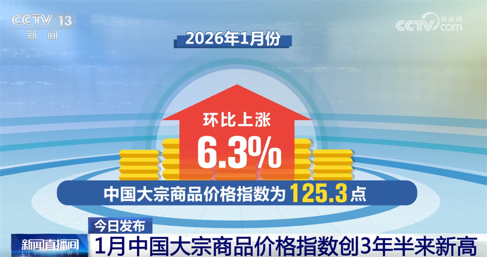 大宗商品价格指数总体情况 - 2026年1月中国大宗商品价格指数为125.3点,环比上涨6.3%,连续九个月环比上涨,创三年半以来新高 [1] - 企业预期保持乐观,生产活动延续扩张态势 [1] - 重点监测的50种大宗商品中,1月份价格环比上涨的有33种 [1] 主要商品价格表现 - 碳酸锂、精炼锡和精炼镍价格涨幅居前,环比分别上涨48.4%、20.2%和19.5% [1] 分行业价格指数变化 - 有色金属价格指数环比大幅上行9.9% [3] - 化工产品价格指数环比大幅上行3.8% [3] - 农产品价格指数环比小幅回升0.2%,市场供需平衡 [3] 价格变动驱动因素与市场展望 - 有色金属与化工产品价格大幅上行受国际货币政策宽松预期、地缘政治和期货市场等输入性因素影响 [3] - 市场总体延续回稳向好态势,但国际金融市场动荡明显加大,部分大宗商品上涨过快 [5] - 需加强外部输入性风险研判,加大宏观政策调节力度,维护产业链供应链稳定 [5]
