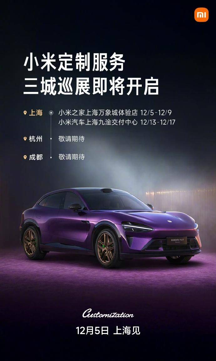 小米汽车定制服务启动巡展 - 公司于12月4日宣布,小米汽车定制服务将在上海、杭州、成都三城开启巡展,首站为上海小米之家万象城体验店,于12月5日展出 [1] 定制服务核心内容与规划 - 公司于今年9月25日宣布推出小米汽车定制服务,目前支持YU7 Max和SU7 Ultra车型,需线下锁单 [5] - 定制服务处于试运营阶段,为期一年,每月限量定制40台 [5] - 服务初期提供紫水晶、竞速红、暮光玫瑰、哑光流金粉、芽黄共5种定制色 [5] - 公司启动了“百色计划”,联合供应商巴斯夫和PPG,目标在3年内设计100款车漆 [5] 定制服务产品展示与工艺细节 - 11月广州车展期间,公司首次对外展出了采用紫水晶定制车漆的YU7 Max车型 [7] - 紫水晶车漆采用双层清漆工艺,历经近50小时手工打磨,旨在呈现深邃璀璨的质感与高级感 [10] - 该车漆被描述为具有“如镜面般光亮照人”、“如水晶般通透”以及“立体流动的光影变幻”的特性 [10]