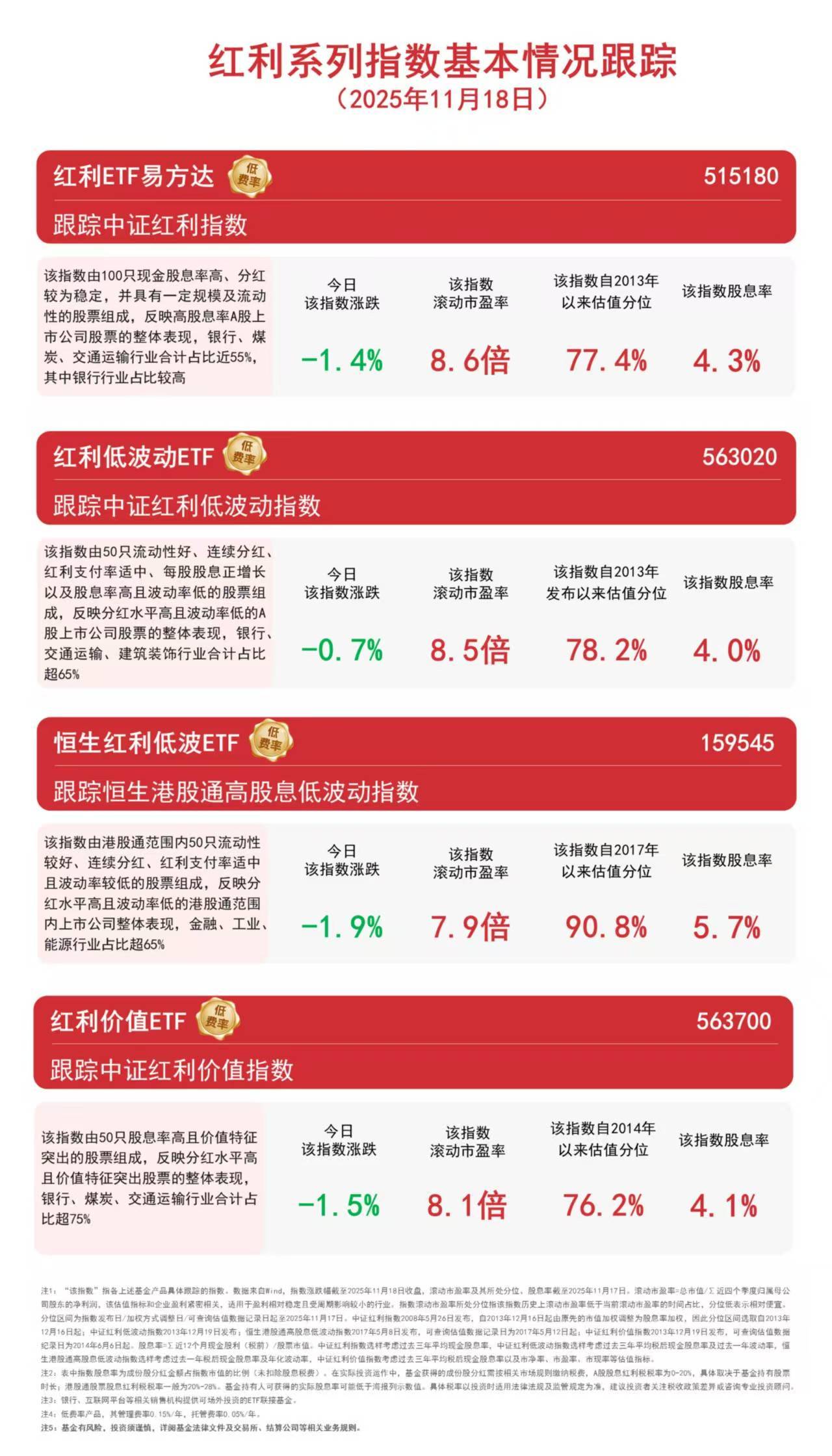 由50只流动性好、连续分红、红利支付率适中、每股股 息正增长以及股息率高且波动率低的股票组成,反映分 红水平高且波动率低的A股上市公司股票的整体表现,银 行、煤炭、交通运输行业合计占比超60% 論 恒生港股通高股息低波动指数 大盘今日集体调整,红利板块跌幅相对较小,恒生红利低波ETF(159545)全天净申购超2000万份。从周维度看,中证红 利低波动指数下跌2.3%,恒生港股通高股息低波动指数下跌3.0%,中证红利价值指数下跌3.1%,中证红利指数下跌3.7%, 恒生红利低波ETF(159545)本周前四日连续"吸金",合计近2亿元。 据悉,易方达基金是目前唯一一家红利类ETF全部实行低费率的基金公司,恒生红利低波ETF(159545)、红利ETF易方达 (515180)、红利低波动ETF(563020)、红利价值ETF(563700)等产品管理费率均为0.15%/年,可助力投资者低成本布 局高股息资产。 | | 中证红利 | 中证红利低 | 恒生养股通 | 中证红利价 | | --- | --- | --- | --- | --- | | | 指数 | 波动指数 | 高股息低波 动指数 | 值指数 | | ...