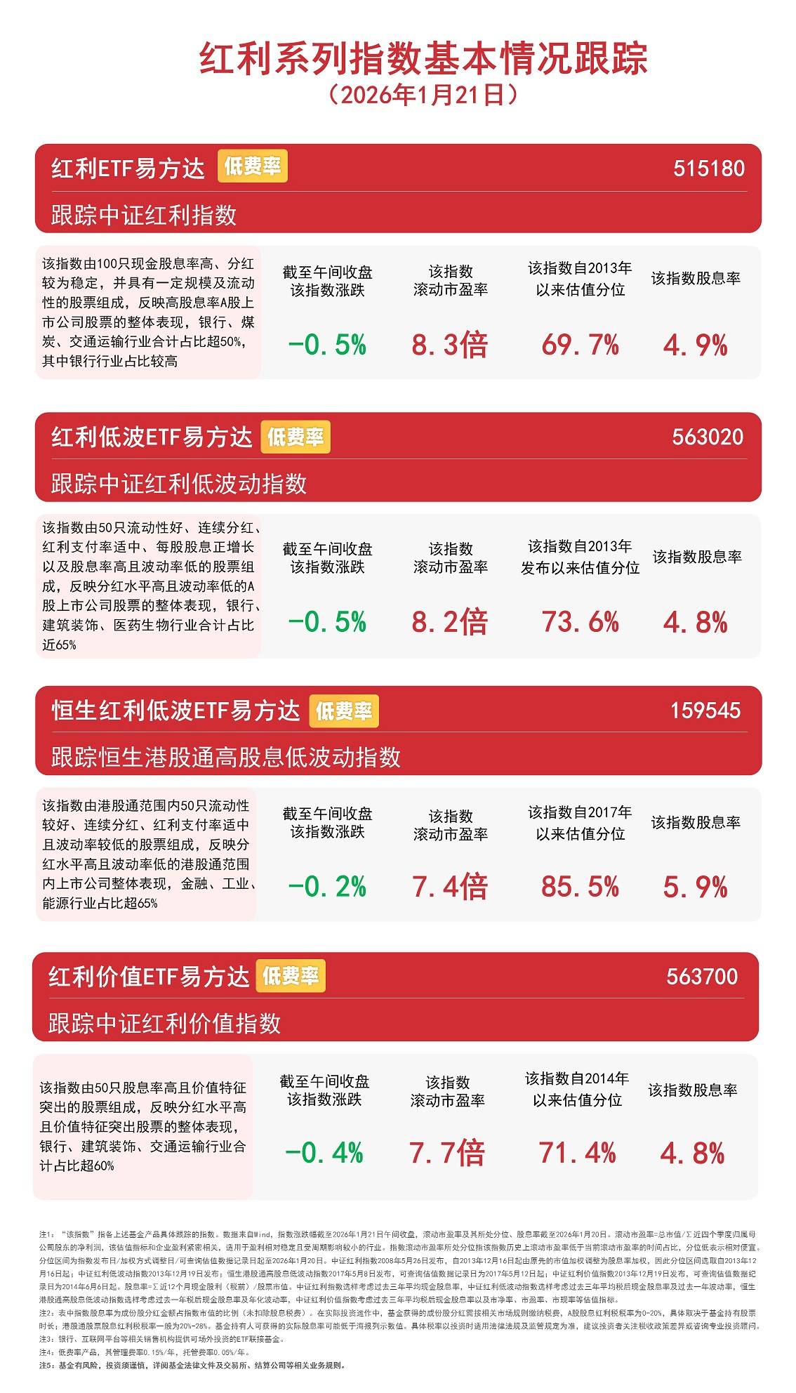 市场表现与资金流向 - 截至收盘,中证红利低波动指数上涨1.5%,中证红利指数与中证红利价值指数均上涨1.2%,恒生港股通高股息低波动指数上涨1.1% [1] - 红利ETF易方达(515180)和红利低波ETF易方达(563020)近两个交易日均连续获资金加仓,合计分别达7700万元和4600万元 [1] 易方达基金产品费率优势 - 易方达基金是目前唯一一家红利类ETF全部实行低费率的基金公司 [1] - 旗下恒生红利低波ETF易方达(159545)、红利ETF易方达(515180)、红利低波ETF易方达(563020)、红利价值ETF易方达(563700)、A500红利低波ETF易方达(563510)等产品的管理费率均为0.15%/年 [1] - 低费率产品管理费率为0.15%/年,托管费率为0.05%/年 [6] 红利ETF易方达(515180)产品详情 - 跟踪中证红利指数,该指数由100只现金股息率高、分红较为稳定、具有一定规模及流动性的股票组成 [3] - 指数反映高股息率A股上市公司股票的整体表现,银行、煤炭、交通运输行业合计占比超50%,其中银行行业占比较高 [3] - 截至2026年1月29日收盘,该指数日涨跌幅为1.2%,滚动市盈率为8.3倍,自2013年以来的估值分位为68.8% [3][5] - 中证红利指数选样考虑过去三年平均现金股息率 [5] 红利低波ETF易方达(563020)产品详情 - 跟踪中证红利低波动指数,该指数由50只流动性好、连续分红、红利支付率适中、每股股息正增长以及股息率高且波动率低的股票组成 [3] - 指数反映分红水平高且波动率低的A股上市公司股票的整体表现,银行、建筑装饰、医药生物行业合计占比近65% [3] - 截至2026年1月29日收盘,该指数日涨跌幅为1.5%,滚动市盈率为8.1倍,自2013年发布以来的估值分位为73.0% [3][5] - 中证红利低波动指数选样考虑过去三年平均税后现金股息率及波动率 [5] 恒生红利低波ETF易方达(159545)产品详情 - 跟踪恒生港股通高股息低波动指数,该指数由港股通范围内50只流动性较好、连续分红、红利支付率适中且波动率较低的股票组成 [3] - 指数反映分红水平高且波动率低的港股通范围内上市公司整体表现,金融、工业行业占比较高 [3] - 截至2026年1月29日收盘,该指数日涨跌幅为1.1%,滚动市盈率为7.8倍,自2017年以来的估值分位为90.6% [3][5] - 恒生港股通高股息低波动指数选样考虑过去一年税后现金股息率及年化波动率 [5] 红利价值ETF易方达(563700)产品详情 - 跟踪中证红利价值指数,该指数由50只股息率高且价值特征突出的股票组成 [4] - 指数反映分红水平高且价值特征突出股票的整体表现,银行、建筑装饰、交通运输行业合计占比超60% [4] - 截至2026年1月29日收盘,该指数日涨跌幅为1.2%,滚动市盈率为7.6倍,自2014年以来的估值分位为70.8% [4][5][7] - 中证红利价值指数选样考虑过去三年平均税后现金股息率以及市净率、市盈率、市销率、市现率等估值指标 [5] 指数编制与数据说明 - 中证红利指数于2009年5月26日发布,自2013年12月16日起由原先的市值加权调整为股息率加权 [5] - 中证红利低波动指数于2013年12月19日发布 [5] - 恒生港股通高股息低波动指数于2017年5月8日发布 [5] - 中证红利价值指数于2013年12月19日发布 [5] - 指数股息率为成份股分红金额占指数市值的比例(未扣除股息税费) [6] - A股股息红利税税率为0-20%,港股通股票股息红利税税率一般为20-28% [6]