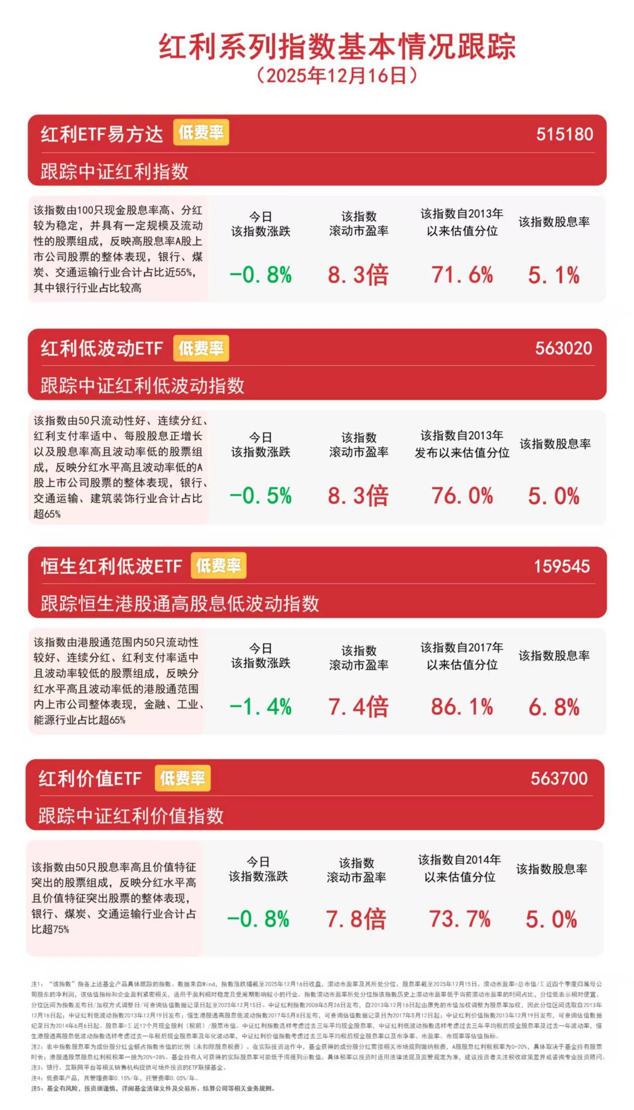 红利板块午后拉升小幅翻红,截至收盘,中证红利指数上涨0.3%,中证红利价值指数上涨0.2%,中证红利低波动指数上涨0.1%,恒生港股通高股息低波动 指数上涨0.03%。相关产品获资金关注,Wind数据显示,截至昨日,红利ETF易方达(515180)和红利低波动ETF(563020)月内净流入均超5亿元。 据悉,易方达基金是目前唯一一家红利类ETF全部实行低费率的基金公司,旗下恒生红利低波ETF(159545)、红利ETF易方达(515180)、红利低波动 ETF(563020)、红利价值ETF(563700)、A500红利低波ETF(563510)等产品的管理费率均为0.15%/年,可助力投资者低成本布局高股息资产。 该指数由50只股息率高且价值特征 突出的股票组成,反映分红水平高 且价值特征突出股票的整体表现, 银行、煤炭、交通运输行业合计占 比超75% 该指数涨跌 滚动市盈率 0. 2% 7.7倍 73.0% 5. 注! "该指数"指各上述基金产品具体润踪的指数。数据来自Wnd,指数涨跌幅股至2025年12月17日收盘,滚动市盘率及其所处分位、股息率使至2025年12月16日。滚动市盈率-总市值/7 周班 ...