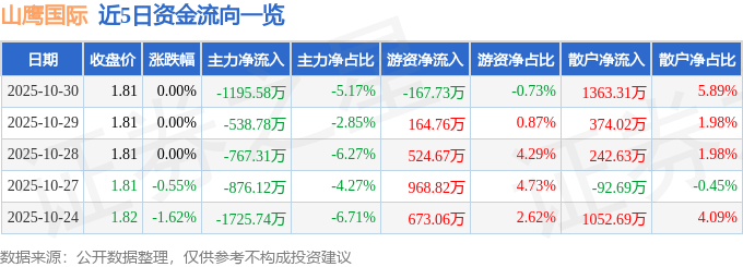 | | | | 日期 收盘价 涨跌幅 主力净流入 主力净占比 游资净占比 散户净流入 散户净占比 | | | | | | --- | --- | --- | --- | --- | --- | --- | --- | | 2025-10-30 | 1.81 0.00% | -1195.58万 | -5.17% | -167.73万 | -0.73% | 1363.31万 | 5.89% | | 2025-10-29 | 1.81 0.00% | -538.78万 | -2.85% | 164.76万 | 0.87% | 374.02万 | 1.98% | | 2025-10-28 | 1.81 0.00% | -767.31万 | -6.27% | 524.67万 | 4.29% | 242.63万 | 1.98% | | 2025-10-27 | 1.81 -0.55% | -876.12万 | -4.27% | 968.82万 | 4.73% | -92.69万 | -0.45% | | 2025-10-24 | 1.82 -1.62% | -1725.74万 | -6.71% | 673.06万 | 2 ...