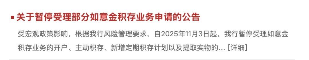 工行一则贵金属业务调整引发市场关注。 11月3日上午,工商银行发布关于暂停受理部分如意金积存业务申请的公告。这是在财政部与国家税务总局联合发布黄金税收新政后,首家宣布调整积存金业务的商 业银行。 当日下午, 建设银行也发布公告称,自2025年11月3日(含)起,暂停受理易存金业务实时买入、新增定投买入、实物金兑换等申请,存量客户易存金定投计划的 执行、赎回以及销户不受影响;暂停个人黄金积存兑换实物贵金属、账户黄金兑换实物贵金属等申请,其他个人黄金积存业务不受影响。 "买金"暂停 工行官网发布的《关于暂停受理部分如意金积存业务申请的公告》显示,"受宏观政策影响,根据我行风险管理要求,自2025年11月3日起,我行暂停受理如意金积 存业务的开户、主动积存、新增定期积存计划以及提取实物的申请,存量客户处于有效期内的定期积存计划的执行以及办理赎回、销户不受影响。" 建设银行当日下午也发了相关公告, 暂停受理易存金等业务 。 同时,多位深圳水贝黄金珠宝市场商家告诉记者,前述政策暂未影响水贝的交易规则,今日仍可买卖、回收黄金,后续将等待政策进一步明确。 此次新政聚焦交易所场内交易增值税优惠与实物交割环节管理,具体来看,会 ...
