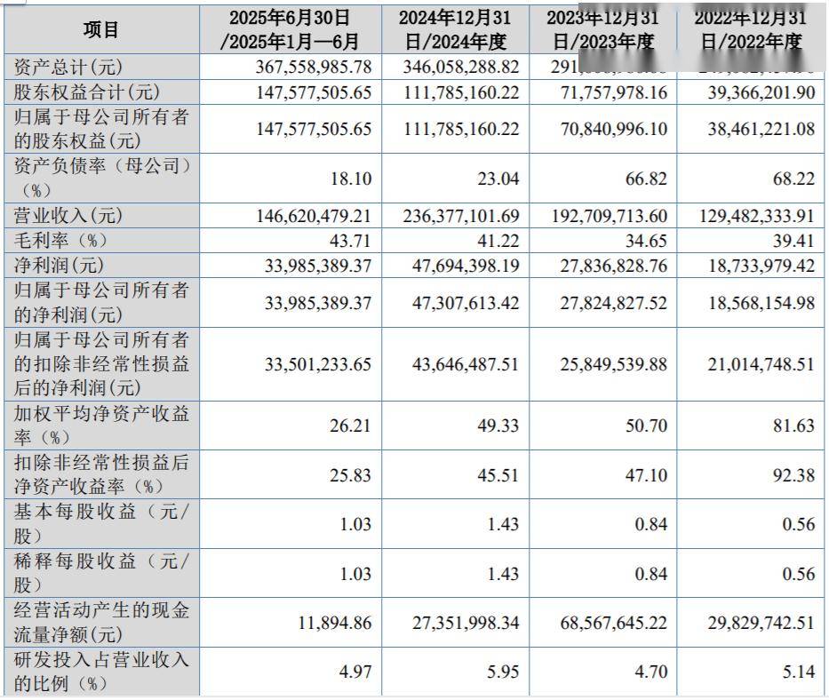 公司IPO进程与基本信息 - 江苏星基智造科技股份有限公司北交所IPO申请于12月25日获受理,保荐机构为财通证券 [1] - 公司成立于2021年4月,主营业务为线缆智能设备及数字化智能工厂解决方案的研发、生产与销售 [1] - 公司业务覆盖汽车线缆、建筑线缆、工业控制线缆、电力与新能源线缆、通信与电子线缆等多个领域 [1] 财务业绩表现 - 2022年至2024年,公司营业收入从1.29亿元增长至2.36亿元,2025年上半年营业收入为1.47亿元 [2] - 2022年至2024年,归属于母公司股东的净利润从1856.82万元增长至4730.76万元,2025年上半年为3398.54万元 [2] - 2025年1-9月,公司营业收入为2.21亿元,同比增长18.18%,归属于母公司股东的净利润为4692.38万元,同比增长27.6% [3] - 报告期内公司毛利率持续改善,从2022年的39.41%提升至2025年上半年的43.71% [2] - 公司加权平均净资产收益率(ROE)处于较高水平,2024年为49.33%,2025年上半年为26.21% [2] - 公司研发投入占营业收入的比例保持在4.70%至5.95%之间 [2] 资产与负债状况 - 截至2025年6月30日,公司资产总计为3.68亿元,股东权益合计为1.48亿元 [2] - 公司资产负债率(母公司)显著下降,从2022年的68.22%降至2025年6月30日的18.10% [2] 股权结构与实际控制人 - 公司实际控制人为周代烈、何松桂夫妇,共同控制公司85.00%的股份 [5] - 周代烈通过直接持股、控制合伙企业及一致行动协议等方式,合计控制公司表决权 [5] - 实际控制人周代烈拥有超过30年的线缆设备行业从业与创业经历 [6] - 实际控制人何松桂长期在公司及其关联企业担任管理职务,现任公司供应链总监 [7]