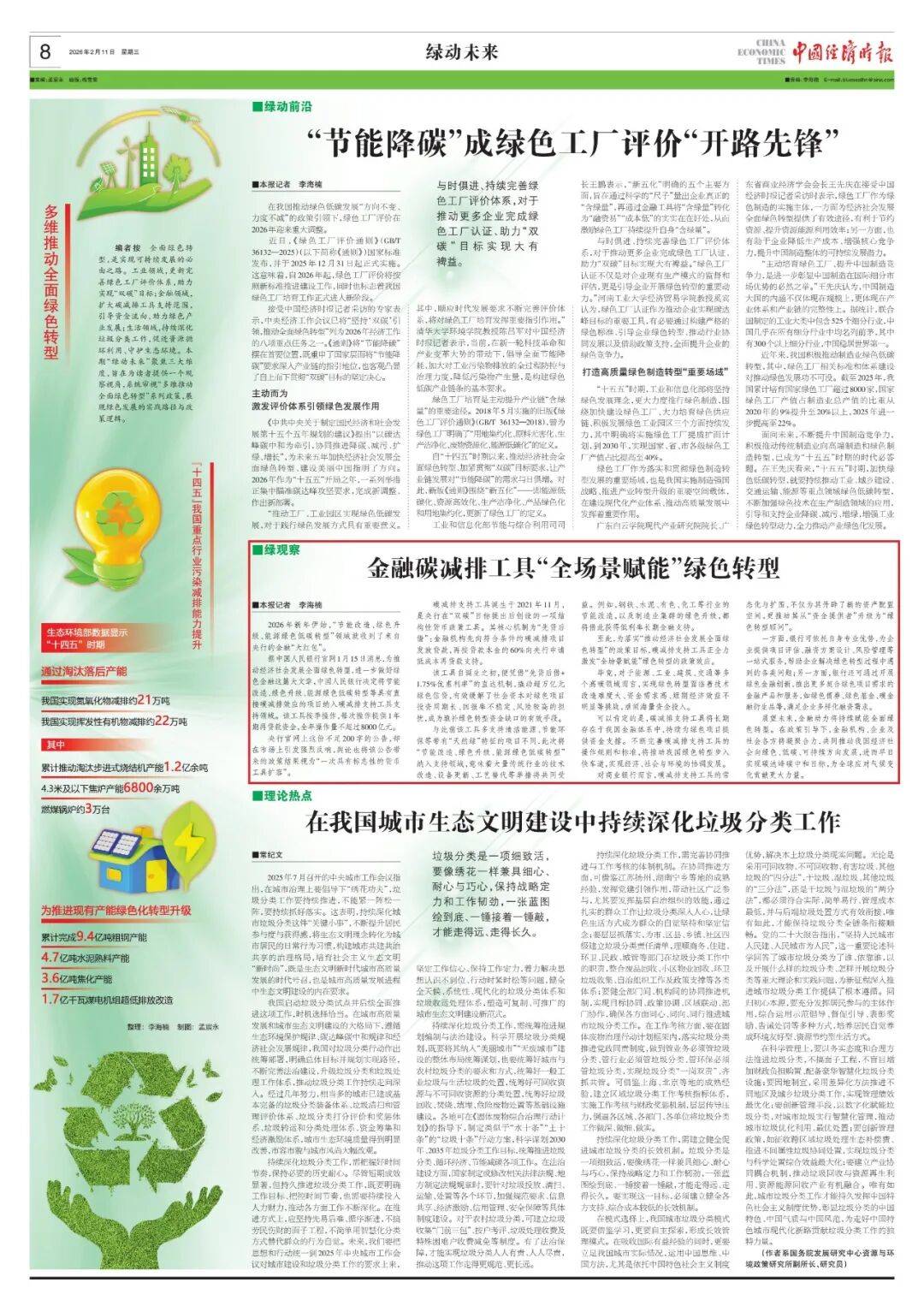 文章核心观点 文章系统阐述了从工业、金融、生活三大维度推动中国经济社会全面绿色转型的政策与实践,核心在于通过更新绿色工厂评价标准、扩容金融支持工具以及深化垃圾分类工作,形成多维合力,加速实现“双碳”目标[1] 工业领域:绿色工厂评价体系更新 - 2025年12月31日起正式实施新版《绿色工厂评价通则》(GB/T 36132-2025)国家标准,标志着绿色工厂评价工作进入新阶段[9] - 新版标准将评价维度从旧版的“四化”更新为“新五化”,即能源低碳化、资源高效化、生产洁净化、产品绿色化和用地集约化[10] - 绿色工厂认证作为推动企业绿色转型的重要工具,旨在通过严格标准引导企业提升“含绿量”,并可能获得“融资易”、“成本低”等实际好处[10][11] - 政策目标明确,计划到2030年实现国家、省、市各级绿色工厂产值占比提高至40%[12] - 截至2025年,中国累计培育国家绿色工厂超过8000家,其产值占制造业总产值的比重从2020年的9%提升至2025年的22%以上[13] - 在推动产能绿色化转型过程中,已累计淘汰步进式烧结机产能1.2亿余吨、43米及以下水泥磨机产能6800余万吨,并完成1.7亿千瓦燃煤机组超低排放改造[7] 金融领域:碳减排支持工具扩容 - 中国人民银行于2026年1月15日宣布,将节能改造、绿色升级、能源绿色低碳转型等具有直接碳减排效应的项目纳入碳减排支持工具支持领域[1] - 该工具按季操作,提供1年期再贷款资金,2026年全年操作量不超过8000亿元人民币[1] - 碳减排支持工具采用“先贷后借”机制,金融机构可按发放贷款本金的60%向央行申请利率为1.75%的低成本再贷款支持[2] - 自2021年11月创设以来,该工具已撬动超过1万亿元人民币的绿色信贷[2] - 此次扩容意味着钢铁、水泥、有色、化工等传统高碳行业的节能改造,以及制造业集群的绿色升级项目将能获得低利率长期金融支持[2] - 工具的常态化与扩围推动商业银行从“资金提供者”升级为“绿色转型顾问”,可提供项目评估、融资方案设计及创新绿色金融产品等服务[4] 生活领域:垃圾分类工作深化 - 中央城市工作会议要求持续推进垃圾分类工作,将其作为城市生态文明建设和高质量发展的内在要求[17] - 经过数年努力,许多城市已建成基本完备的垃圾分类装备体系、收运处理体系及资金筹集激励体系,城市生态环境质量得到明显改善[17] - 未来工作重点包括:完善法治保障,加强垃圾投放、运输、处置各环节的制度建设[19];完善协同推进与考核机制,建立四级责任清单并实施“党政同责”[20];建立长效管理机制,探索符合国情的分类模式(如“四分法”),不搞劳民伤财的面子工程[20][21][22]