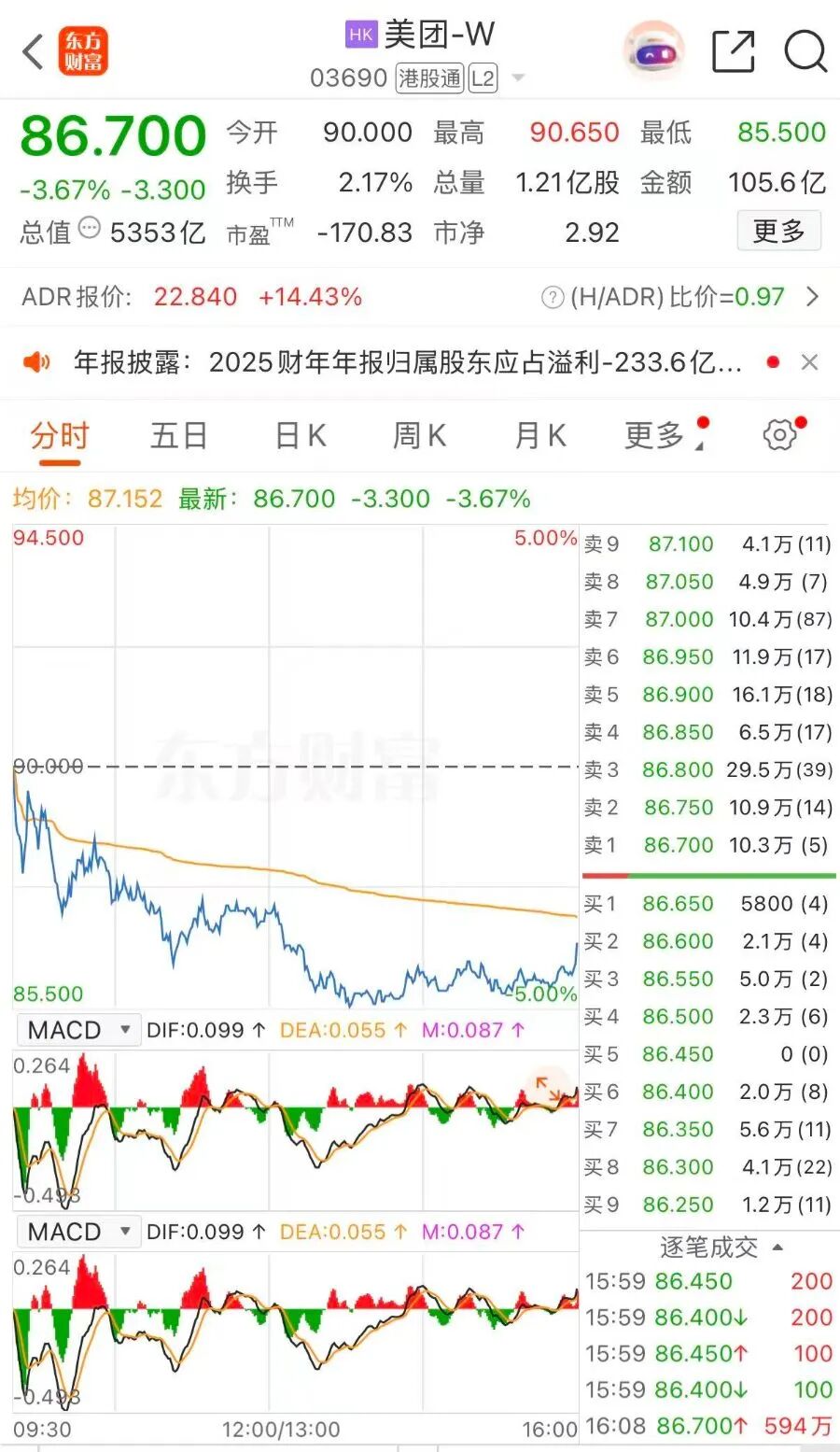 公司第四季度及全年财务表现 - 第四季度营收为921.0亿元人民币,同比增长4.1%,略高于市场预估的920.8亿元人民币 [1][3] - 第四季度调整后净亏损为150.8亿元人民币,而去年同期为盈利98亿元人民币,同比由盈转亏 [1][3] - 全年营收为3,648.5亿元人民币,同比增长8%,略低于市场预估的3,661.3亿元人民币 [1][3] - 全年净亏损为233.6亿元人民币,优于市场预估的亏损241.1亿元人民币 [1][3] - 全年调整后净亏损为186.5亿元人民币,高于市场预估的亏损168.6亿元人民币 [1][3] 资本市场反应 - 3月26日,公司港股股价下跌3.67%,收报86.7港元 [1][3] - 当日股价最低触及86.7港元,最高为90.0港元 [4] - 公司总市值为5,353亿港元 [1][3][4] - 当日成交金额为105.6亿港元,成交量为1.21亿股 [4] - 公司市盈率为-170.83,市净率为2.92 [4]
