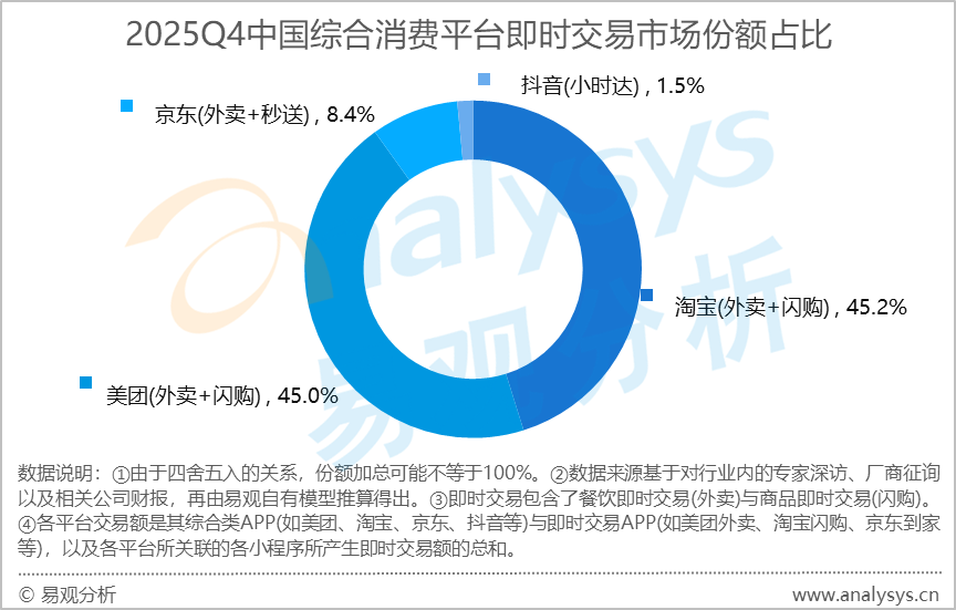 2025年第四季度中国即时零售市场格局与动态 - 2025年第四季度,淘宝闪购在即时零售市场的成交份额达到45.2%,美团以45%的份额紧随其后,两者差距仅0.2个百分点,市场呈现双雄并立格局 [1] - 京东即时交易以8.4%的份额位列第三,抖音小时达平台占据1.5%的市场份额 [3] - 市场已从美团一家独大演变为阿里巴巴与美团双雄争霸 [3] 市场规模与增长 - 2025年中国综合消费平台即时交易市场规模达到29852亿元,同比增长21.4% [1] - 2025年第四季度市场规模为8118亿元,同比增长15.6% [1] - “双11”购物季的促销热潮从传统电商延伸至即时交易场景,有效支撑了第四季度整体市场规模维持在较高水平 [1] 阿里巴巴的战略与进展 - 2025年4月,淘宝天猫旗下“小时达”服务升级为“淘宝闪购”,并在手机淘宝App首页获得一级入口 [3] - 2025年12月,“饿了么”APP正式更名为“淘宝闪购”,完成了业务、架构到品牌标识的全面统一 [3] - 2025年8月,淘宝闪购日订单峰值已达1.2亿单,周日均订单量达8000万单,月度交易买家数突破3亿 [3] - 公司将淘宝闪购的市场份额扩张定为2026年度核心战略,承诺“坚定加大投入”以争夺市场绝对第一的地位 [3] 美团的应对与布局 - 美团凭借本地生活运营经验和庞大的骑手网络持续拓展护城河 [4] - 2025年10月,美团与李宁达成合作,后者在全国近百个城市的近千家门店入驻美团闪购,此前已有滔搏、安踏等多个品牌接入 [4] - 美团持续推进“闪电仓”前置仓网络建设,截至2025年9月,在线仓数已突破5000家 [4] - 公司计划到2027年将闪电仓数量推至10万个,催生2000亿元的市场规模 [4] 行业竞争与财务影响 - 持续的规模扩张和高额投入对平台的盈利能力构成巨大压力 [4] - 2025年第三季度,阿里巴巴和美团均因对即时零售等业务的投入而导致核心利润指标出现显著下滑 [4] - 行业加码投入旨在强化“快”的用户心智,目标是打造一站式消费平台 [4] - 长期视角下,测算行业规模有望达2.4万亿元,但可兑现的直接盈利回报相对有限 [5]