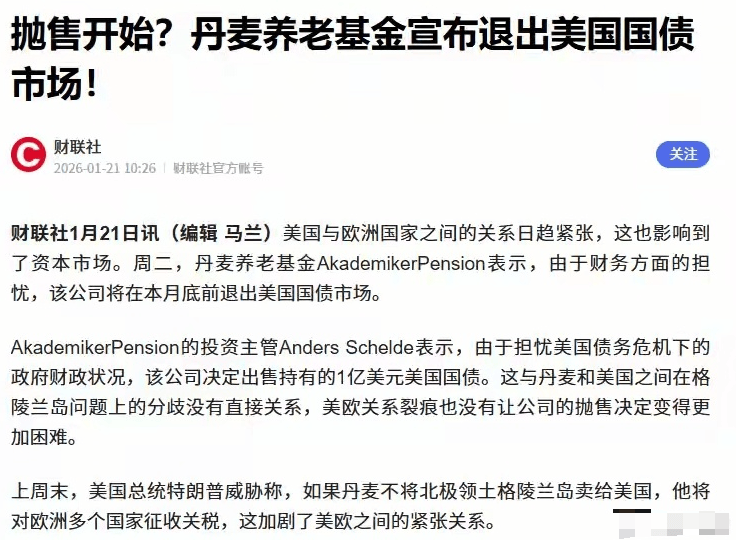 美欧地缘政治紧张与资产抛售风险 - 美国总统特朗普警告,若欧洲抛售美国资产,美国将实施重大报复 [1][3] - 欧洲持有数万亿美元的美债和美股,抛售被视为潜在反制措施 [3] 欧洲资本对美国资产的减持行动 - 瑞典最大私人养老基金阿莱克塔在过去一年已出售其持有的大部分美国国债,理由是美国政府的不可预测性及债务增长 [4] - 丹麦学界养老基金宣布将在本月底前抛售1亿美元美债,另一家丹麦养老基金PBU也在出售美债,以降低对美国依赖及防范制裁风险 [4] - 格陵兰岛养老基金正考虑是否继续投资美国股票,减持美国资产被视为抵制特朗普政府企图控制格陵兰岛的象征性举动 [6][7] - 英国养老基金正在缩小对美国股票的风险敞口,因担忧美国人工智能领域泡沫,这些基金为储户管理总计超过2000亿英镑资产 [7] 美国官方对欧洲减持的回应 - 美国财政部长贝森特淡化欧洲减持影响,称丹麦对美债的投资“无关紧要”,并表示不担心欧洲撤离美债市场 [5] 欧洲政治领导人的表态与行动 - 西班牙首相桑切斯批评美国政府不尊重国际法,对美欧关系造成冲击,强调欧洲必须加强团结并向世界其他地区开放 [8] - 丹麦首相弗雷泽里克森访问格陵兰岛,表达对格陵兰人民的支持,并表示将通过外交和政治途径解决格陵兰岛问题 [9] 格陵兰岛地区的军事动态 - 丹麦国防军在格陵兰岛的康克鲁斯瓦格设立临时军事区用于存放装备,并计划在努克港口码头设立另一临时军事区 [10] - 相关军事区将持续进行安保工作,未经授权人员不得进入 [11]