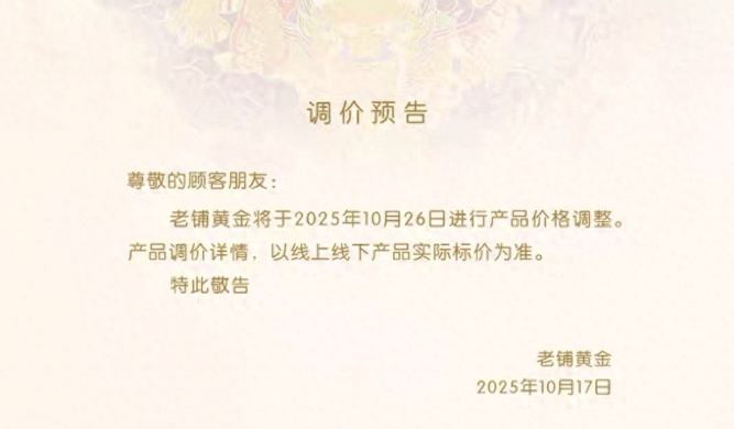 公司调价动态 - 老铺黄金于10月26日实施年内第三次产品提价 [2] - 本次多款产品涨幅超过20%,加价力度大于8月份5%-13%的涨幅 [2] - 公司于10月17日发布调价预告,产品实际标价以线上线下门店为准 [2] - 公司每年进行2-3次调价,此前两次分别在2月和8月 [2] 公司业务拓展 - 10月25日老铺黄金入驻上海恒隆广场,成为唯一实现中国十大高端商场全覆盖的中国高端品牌 [2] - 截至10月25日凌晨2点30分,老铺黄金恒隆广场店当日可接待顾客人数已达到上限 [2]