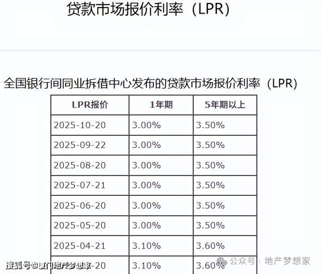 市场预期的分化,从未如此剧烈! 4、10月20日,LPR维持不变。 在酝酿大招需要综合平衡效果,还是任由近年的"组合拳"折戟沉沙?市面上颇有争议。 二、论市场: | LPR报价 | 1年期 | 5年期以上 | | | --- | --- | --- | --- | | 2025-10-20 | 3.00% | 3.50% | | | 2025-09-22 | 3.00% | 3.50% | | | 2025-08-20 | 3.00% | 3.50% | | | 2025-07-21 | 3.00% | 3.50% | | | 2025-06-20 | 3.00% | 3.50% | | | 2025-05-20 | 3.00% | 3.50% | | | 2025-04-21 | 3.10% | 3.60% | | | 02-精密-20 | 3.10% | つ COON AM コ | ﻪ 地产梦想家 | 一、资讯见闻: 近期,市场各方关注的重点略有不同。 1、大A突破了3800点; 2、黄金疯狂上涨,突破4000美金每盎司; 3、全球的房子疯涨。 日本:核心区房价平均涨幅17%,东京23区上涨更猛,平均突破 ...