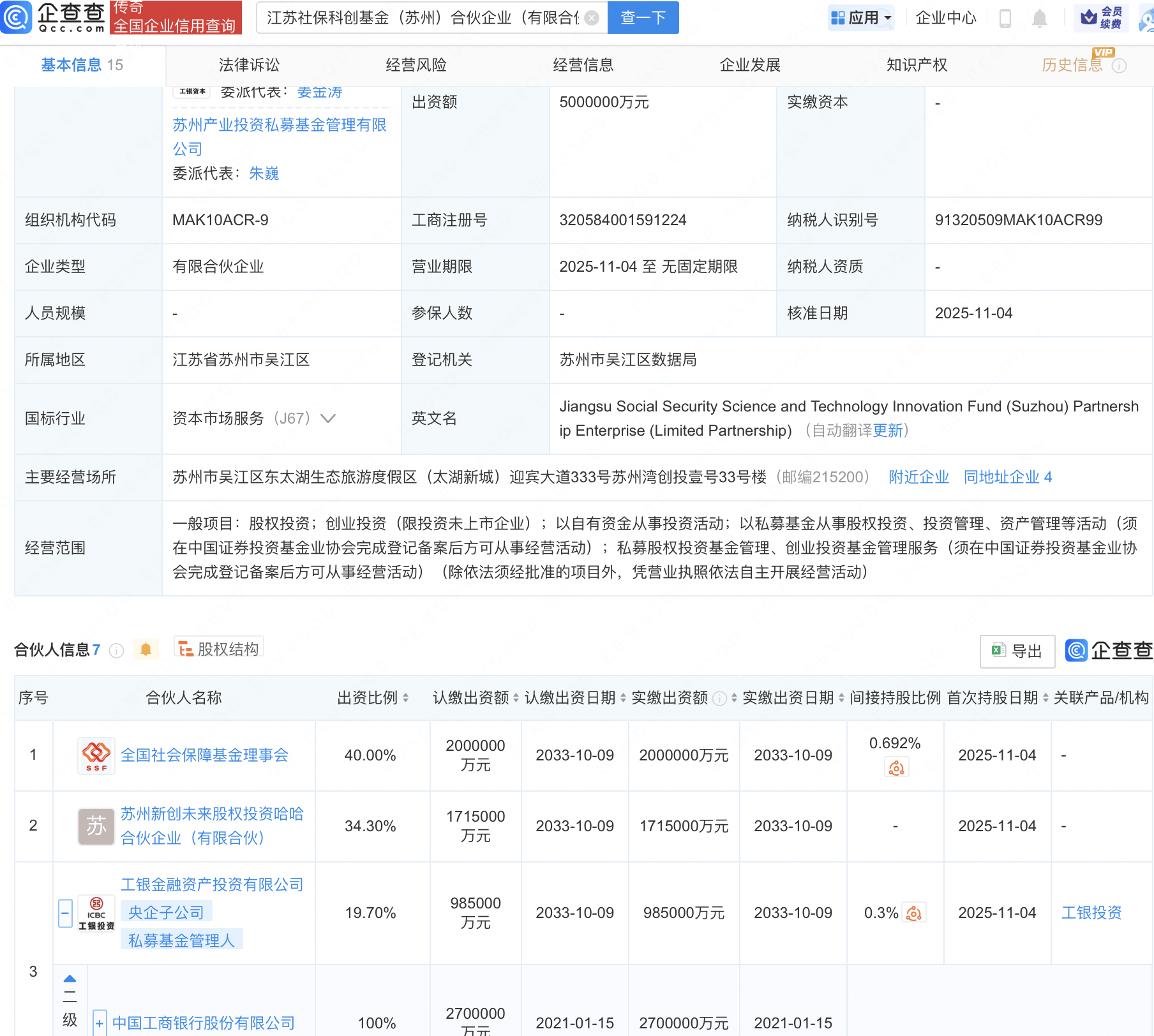每经AI快讯,天眼查工商信息显示,近日,中金舍弗勒(苏州)产业投资基金合伙企业(有限合伙)成立,执行事务合伙人为中金私募股权投资管理有限公司, 出资额10.1亿元,经营范围为创业投资、股权投资。合伙人信息显示,该基金由扬州龙川控股金融投资有限公司、太仓高新投资管理有限公司、舍弗勒投资 (中国)有限公司、中金私募股权投资管理有限公司等共同出资。 | 基本信息 10 | 法律诉讼 | 经营风险 | 经营信息 公i | | --- | --- | --- | --- | | 执行事务合伙人 | 中金私募股权投资管理有限公司 6 ୍ମାନଙ୍କ | 登记状态 ② | 存续 | | | 委派代表:徐怡 | 成立日期 | 2025-10-21 | | 统一社会信用代码 ⑦ | 91320585MAEXW81Y33 | 出资额 | 101000万人民币 | | 工商注册号 | 320585500004958 | 纳税人识别号 ② | 91320585MAEXW81Y33 | | 营业期限 | 2025-10-21 至 无固定期限 | 纳税人资质 | | | 企业类型 | 有限合伙企业 | 行业 | 资本市场服务 | | 参 ...