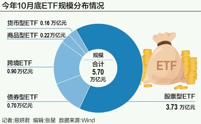 在工具类基金产品需求旺盛背景下,ETF市场持续扩容。 据Wind统计,截至10月31日,ETF市场的总规模(不含联接基金,下同)达到5.7万亿元,较2024年底增加了近2万亿元,增幅约为53%。 其中,股票型ETF、债券型ETF是助推ETF市场扩容的主力军:今年前10个月,这两类ETF的规模分别增加了8313.18亿元、5260.71亿元;跨境 ETF亦呈现出较快的增长势头,贡献了4722.24亿元规模增量。 同时,从单只产品看,ETF"百亿俱乐部"呈现不断扩张之势。截至10月31日,规模达到百亿元以上的ETF产品共有118只,较2024年末增加了52 只。 受访人士向21世纪经济报道记者指出,ETF低费率、一篮子股票组合的特征,能让投资者以较低成本一键布局多只股票,降低个股波动带来的 风险。在股市波动较大、指数化投资持续普及的背景下,投资者对分散风险的重视程度也在不断提升,这很大程度上增强了市场对ETF的认可 度和青睐度。 股票ETF规模增加8313亿元 今年以来,指数化投资的发展进一步提速,场内ETF总规模在4月突破4万亿大关后,又在8月攻下5万亿关口;到了10月底,ETF市场容量已达 到5.7万亿元。  ...