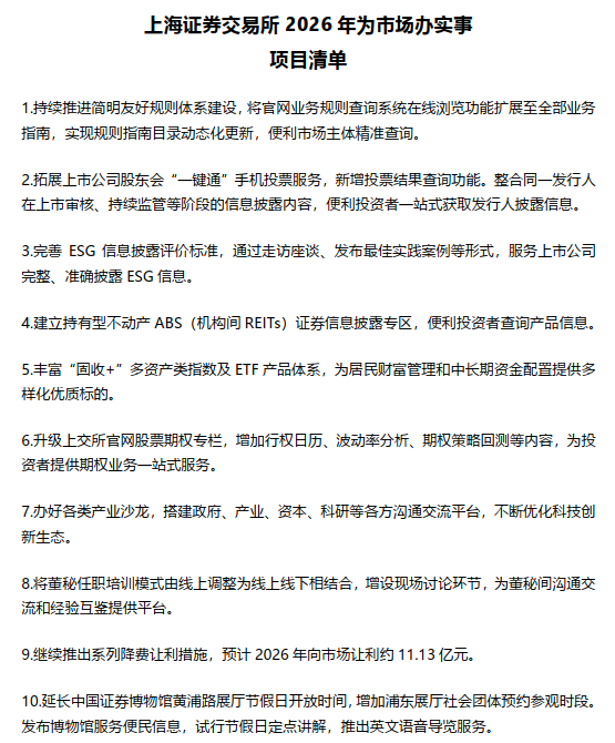 上海证券交易所2026年办实事项目清单核心内容 - 上交所发布2026年为市场办实事项目清单 涵盖上市审核 一线监管 产品创新 市场服务 投资者保护 信息技术等主要业务领域 共五个方面十件实事 [1] 优化信息公开与便利性 - 拓展官网业务规则查询系统在线浏览功能至全部业务指南 [1] - 整合同一发行人在上市审核 持续监管等阶段的信息披露内容 [1] - 建立持有型不动产ABS证券信息披露专区 [1] 提升监管服务与公司治理 - 完善ESG信息披露评价标准 [1] - 拓展上市公司股东会“一键通”手机投票服务 [1] - 将董秘任职培训模式由线上调整为线上线下相结合 [1] 丰富投资产品与工具 - 进一步完善“固收+”多资产类指数体系 [1] - 加强指数及ETF产品宣传推广 [1] 深化市场综合服务 - 举办各类产业沙龙 搭建政府 产业 资本 科研等各方沟通交流平台 [1] - 升级官网股票期权专栏 [1] - 提升中国证券博物馆展览和服务功能 [1] 降低市场运行成本 - 持续推进降费让利 预计2026年向市场让利约11.13亿元 [1] 市场反馈与生态建设 - 上交所欢迎各市场参与人就项目清单提出意见与建议 [2] - 旨在共同构建更加透明 高效 友好的市场生态 [2]