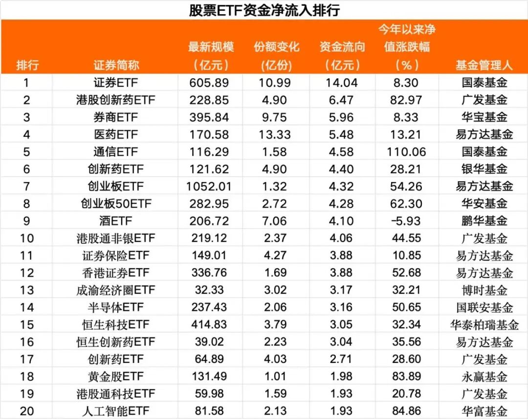 市场资金流向 - 10月29日股票ETF市场整体净流出资金约7.88亿元,总份额减少22.02亿份 [2][10] - 从全市场ETF看,10月20日资金净流出34.9亿元,商品ETF和行业主题ETF净流出居前,达28.52亿元 [10] - 宽基ETF与债券ETF呈现资金净流入,分别达18.92亿元和12.52亿元,宽基ETF规模上升351.81亿元 [11]   行业主题ETF表现 - 红利板块成为资金净流出重点,银行、有色、煤炭等行业主题ETF被资金“获利了结” [3][10] - 具体来看,证券ETF、银行ETF、国防ETF资金净流出居前,分别为-10.50亿元、-5.70亿元、-4.16亿元 [11] - 新能源电池板块相关ETF也出现资金净流出,电池50ETF、电池ETF净流出分别为-3.72亿元和-3.36亿元 [11]   板块涨跌幅 - 光伏类ETF全线大涨,光伏龙头ETF、天弘光伏ETF单日涨幅分别达8.81%和8.75% [4][5] - 新能源电池板块ETF涨幅显著,新能源ETF易方达、电池ETF嘉实等基金单日涨幅均超6% [6] - 银行板块表现不佳,银行ETF易方达、银行ETF天弘等多只基金跌幅接近2% [7]   成交活跃度 - 10月29日股票ETF总成交额为1908.64亿元,较前一交易日的2144.05亿元缩量近11% [5] - 香港证券ETF成交活跃度最高,单日成交额达148.72亿元 [5] - 另有2只ETF成交额在50亿元以上,5只ETF成交额突破40亿元 [5]   头部公募ETF动态 - 易方达基金ETF总规模达8406.7亿元,当日规模增加96.7亿元,2025年以来规模增加2400.2亿元 [15] - 易方达旗下证券保险ETF净流入6.9亿元,最新规模近150亿元,创历史新高 [15] - 华夏基金旗下A500ETF基金和科创50ETF单日净流入居前,分别为6.28亿元和3.01亿元 [15]   资金净流入板块 - 从指数维度看,中证A500指数净流入居前,达11.74亿元 [12] - 近5日资金流入上证50指数和中证A500指数均超24亿元 [12] - 具体产品中,科创芯片ETF、证券保险ETF、通信ETF资金净流入领先,分别为9.08亿元、6.92亿元和6.32亿元 [13]