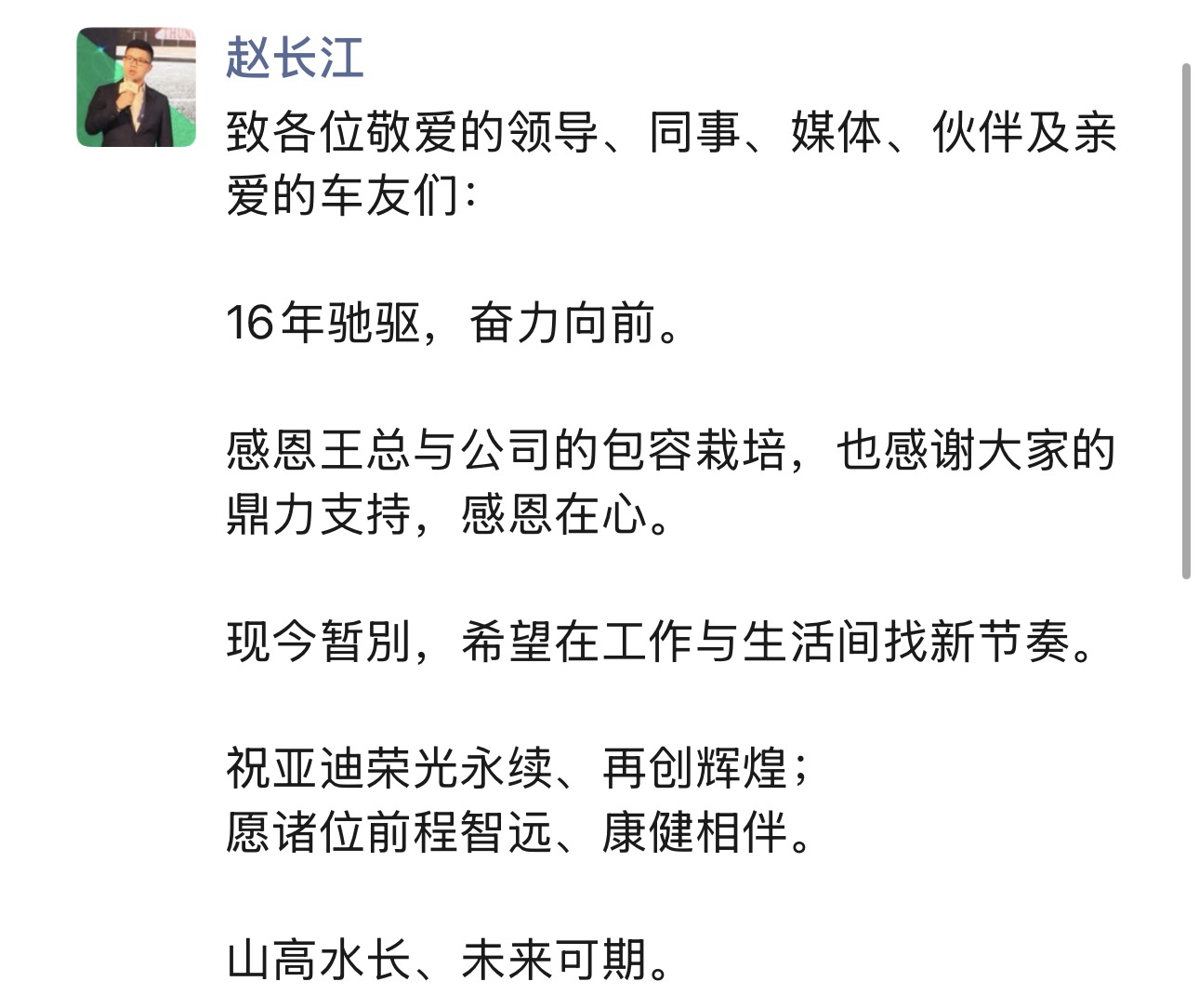 效力16年后,原腾势总经理赵长江宣布离开比亚迪