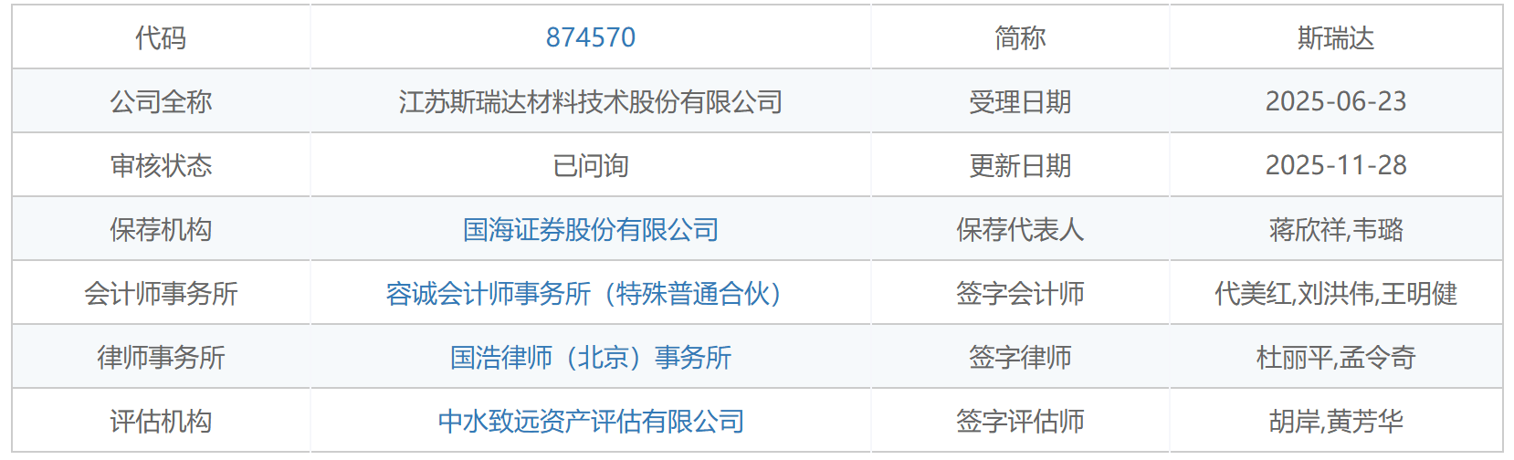 深圳商报·读创客户端记者 梁佳彤 11月28日,据北交所官网,江苏斯瑞达材料技术股份有限公司(下称"斯瑞达")回复首轮问询,公司转贷、关联方资金占用、第三方代发职工薪酬等财务内 控不规范情况受到监管层的关切。 | 代码 | 874570 | | | --- | --- | --- | | 公司全称 | 江苏斯瑞达材料技术股份有限公司 | 류 | | 审核状态 | 已问询 | ਦੇਵ | | 保荐机构 | 国海证券股份有限公司 | 保存 | | 会计师事务所 | 容诚会计师事务所 (特殊普通合伙) | 签字 | | 律师事务所 | 国浩律师(北京)事务所 | 容 | | 评估机构 | 中水致远资产评估有限公司 | 종후 | 招股书介绍,斯瑞达主要从事功能高分子材料研发、生产及销售,产品主要是以高分子涂层为核心的功能胶带材料和膜材料,为消费电子、新能源汽车等终 端行业领域的客户提供全方位、深层次的电子胶粘、电磁兼容与屏蔽、转移保护、耐老化等系统化解决方案。 公司以OLED制程保护膜材料为突破口,成功帮助国内显示屏龙头企业维信诺实现该材料的供应链本土化;公司开发的新能源电池模组功能材料已稳定向比 亚迪、宁德时代等国 ...