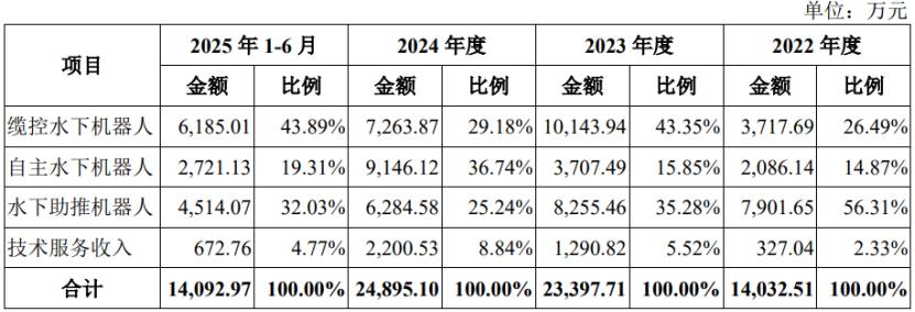 机器人作为数字经济时代的标志性工具,正改变着人类的生产和生活方式,随着人类探索的空间范围从陆域、空域逐 渐拓展至包含海洋和内河湖泊在内的广阔水域,水下机器人也受到关注。 | 项目 | 2025年1-6月 | | 2024 年度 | | 2023 年度 | | 2022 年度 | | | --- | --- | --- | --- | --- | --- | --- | --- | --- | | | 金额 | 比例 | 金额 | 出例 | 金额 | 比例 | 金额 | 比例 | | 缆控水下机器人 | 6,185.01 | 43.89% | 7,263.87 | | 29.18% 10,143.94 | 43.35% | 3,717.69 | 26.49% | | 自主水下机器人 | 2,721.13 | 19.31% | 9.146.12 | 36.74% | 3.707.49 | 15.85% | 2,086.14 | 14.87% | | 水下助推机器人 | 4,514.07 | 32.03% | 6,284.58 | 25.24% | 8,255.46 | 35.28% | 7,901.65 | 56 ...