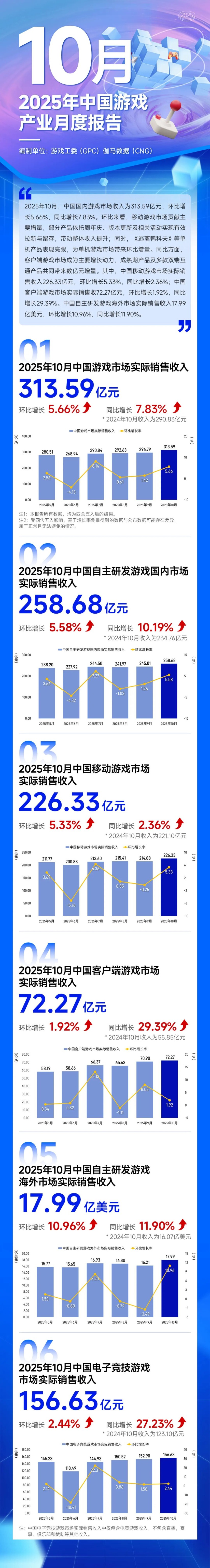 新华财经上海11月26日电中国音数协游戏工委与伽马数据日前发布《2025年10月中国游戏产业月度报告》显示,10 月,中国国内游戏市场收入313.59亿元,环比增长5.66%,同比增长7.83%。 具体来看,10月,国内移动游戏市场贡献主要增量,实际销售收入226.33亿元,环比增长5.33%,同比增长2.36%。中 国客户端游戏市场实际销售收入72.27亿元,环比增长1.92%,同比增长29.39%。此外,中国自主研发游戏海外市场实 际销售收入17.99亿美元,环比增长10.96%,同比增长11.90%。 2025年10月中国自主研发游戏国内 实际销售收入 258.68亿元 环比增长 5.58% ↑ 同比增长 10.19% ↑ * 2024年10月收入为234.76亿元 =中国自主研发游戏国内市场实际销售收入 →环比增长率 300.00 15 亿元 258.68 9/a 244.50 245.01 241.97 238.20 227.92 9 7.27 200.00 5 5.58 3.66 1.26 -1.03 100.00 -5 -4.32 0.00 -15 2025年5月 2025年6月 2025年7月 ...
