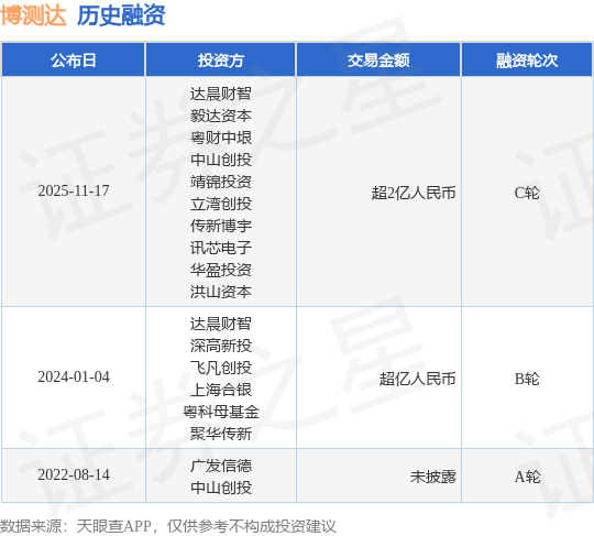 | 公布日 | 投资方 达晨财智 | 交易金额 | 融资轮次 | | --- | --- | --- | --- | | | 毅达资本 粤财中垠 | | | | | 中山创投 | | | | 2025-11-17 | 靖锦投资 | 超2亿人民币 | C轮 | | | 立湾创投 | | | | | 传新博宇 | | | | | 讯芯电子 | | | | | 华居投资 | | | | | 洪山资本 | | | | | 达晨财智 | | | | | 深高新投 | | | | 2024-01-04 | 飞凡创投 | 超亿人民币 | B轮 | | | 上海合银 | | | | | 粤科母童美 | | | | | 聚华传新 | | | | 2022-08-14 | 广发信德 | 未披露 | A轮 | | | 中山创投 | | | 证券之星消息,根据天眼查APP于11月17日公布的信息整理,广东博测达科技股份有限公司C轮融资, 融资额超2亿人民币,参与投资的机构包括达晨财智,毅达资本,粤财中垠,中山创投,靖锦投资,立 湾创投,传新博宇,讯芯电子,华盈投资,洪山资本。 数据来源:天眼查APP 以上内容为证券之星据公开信息整理 ...