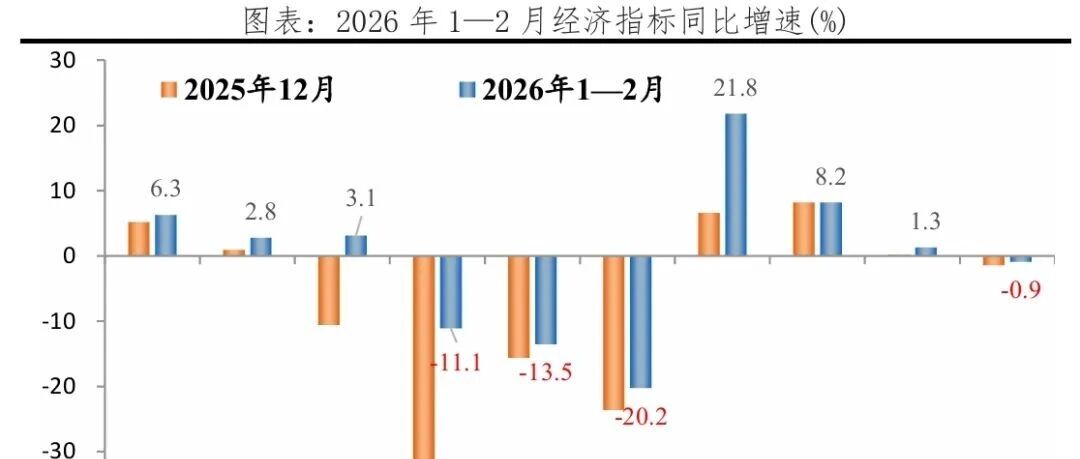 宏观经济表现 - 基于生产法测算的月度GDP同比增速为5.2%,较去年12月回升0.5个百分点[1] - 1-2月工业增加值同比增长6.3%,增速较去年12月加快1.1个百分点[1] - 1-2月服务业生产指数同比增长5.2%,增速仅较前值小幅提升0.2个百分点[1] - 1-2月高技术产业增加值同比大幅回升2.1个百分点至13.1%[16] 需求端数据 - 1-2月固定资产投资累计同比增速由负转正,大幅回升至1.8%[1] - 1-2月社会消费品零售总额累计同比增长2.8%,环比增速创近十年新高[1] - 1-2月出口金额累计达6565.78亿美元,同比增长19.2%[1] - 2月单月出口同比增速高达39.6%,1月为10.0%[36] 结构性与风险因素 - 居民贷款依然偏弱,服务消费增速较去年12月回落,显示内需基础不牢[2] - 出口走强受益于全球AI投资上行周期及地缘政治引发的提前备货[1][42] - 政策支持包括2026年初宽裕的财政结余及8000亿元政策性金融工具加速落地[2] - 主要风险在于政策刺激力度减弱及海外经济政策不确定性[2][46]